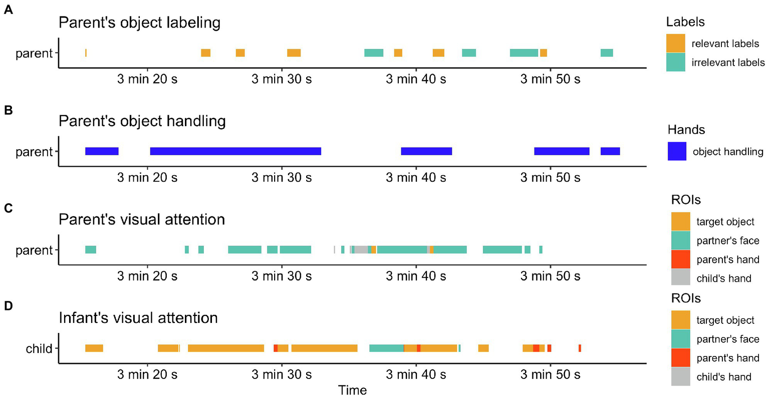 In addition to the parent’s attention patterns and phrases, object manipulation was also annotated from one’s egocentric views. The wall and ceiling views were also treated as supplementary references when the parent’s object handling was not easily interpreted or not captured by the head-mounted cameras. Each of the parental references was manually annotated separately and then time-stamped together in correspondence with the timeline of the play session (see Figure 1).