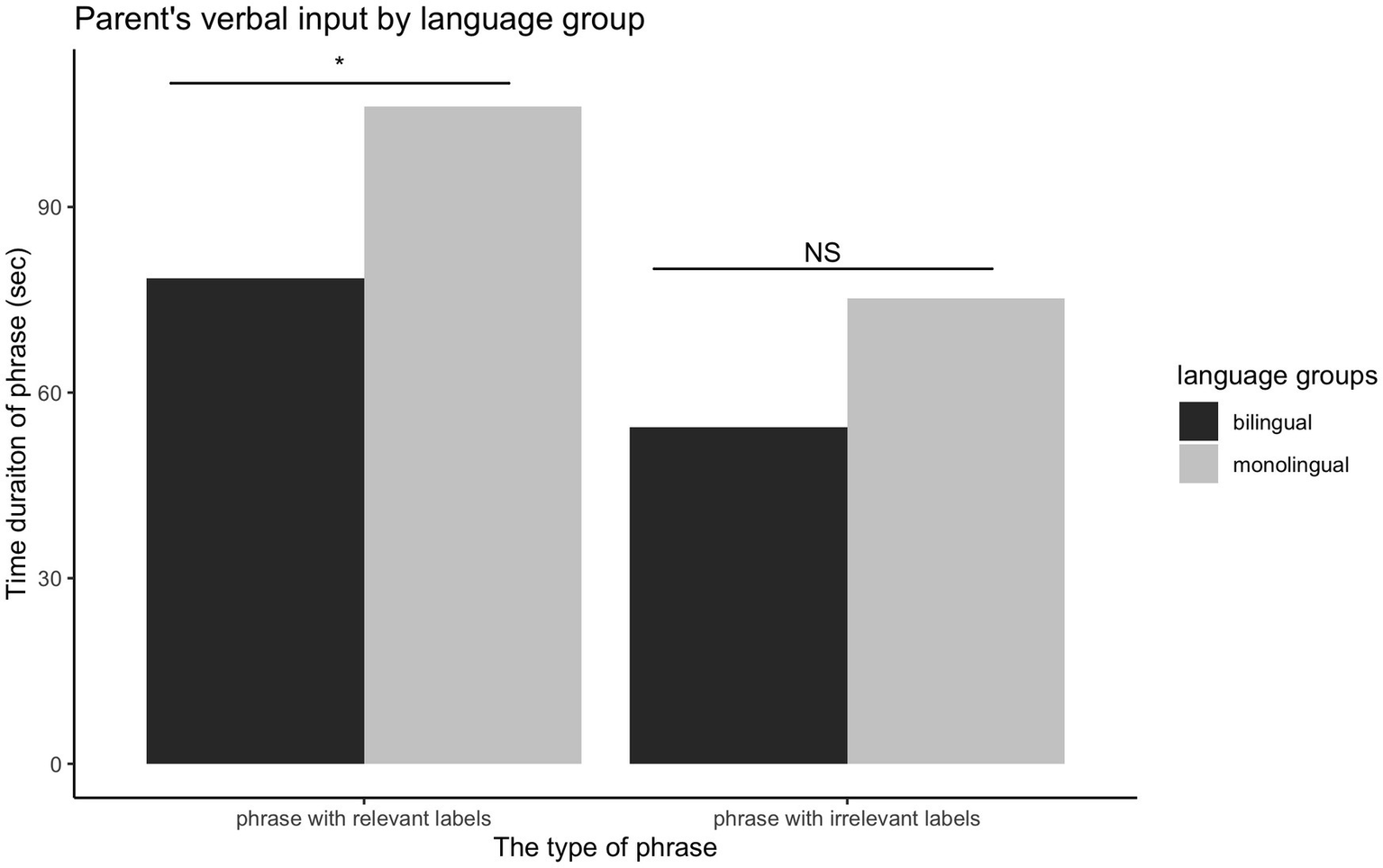 Moreover, parent’s phrases and the use of target words were transcribed and counted. A total of 5,122 phrases were added in the following analyses. Of all the phrases, 22.8% of phrases in the bilingual sample (N = 2,591) were translated from other languages by research assistants who are fluent in the respective language. Bilingual parents’ language usages and the number of translated phrases can be found in the Supplementary Material. The reliability was achieved by randomly selecting 25% of the total phrases by dyad and met the inter-coder agreement of 95% or above. Considering the majority of infants vocalized only during the play session, their verbal responses were excluded in the following analyses.