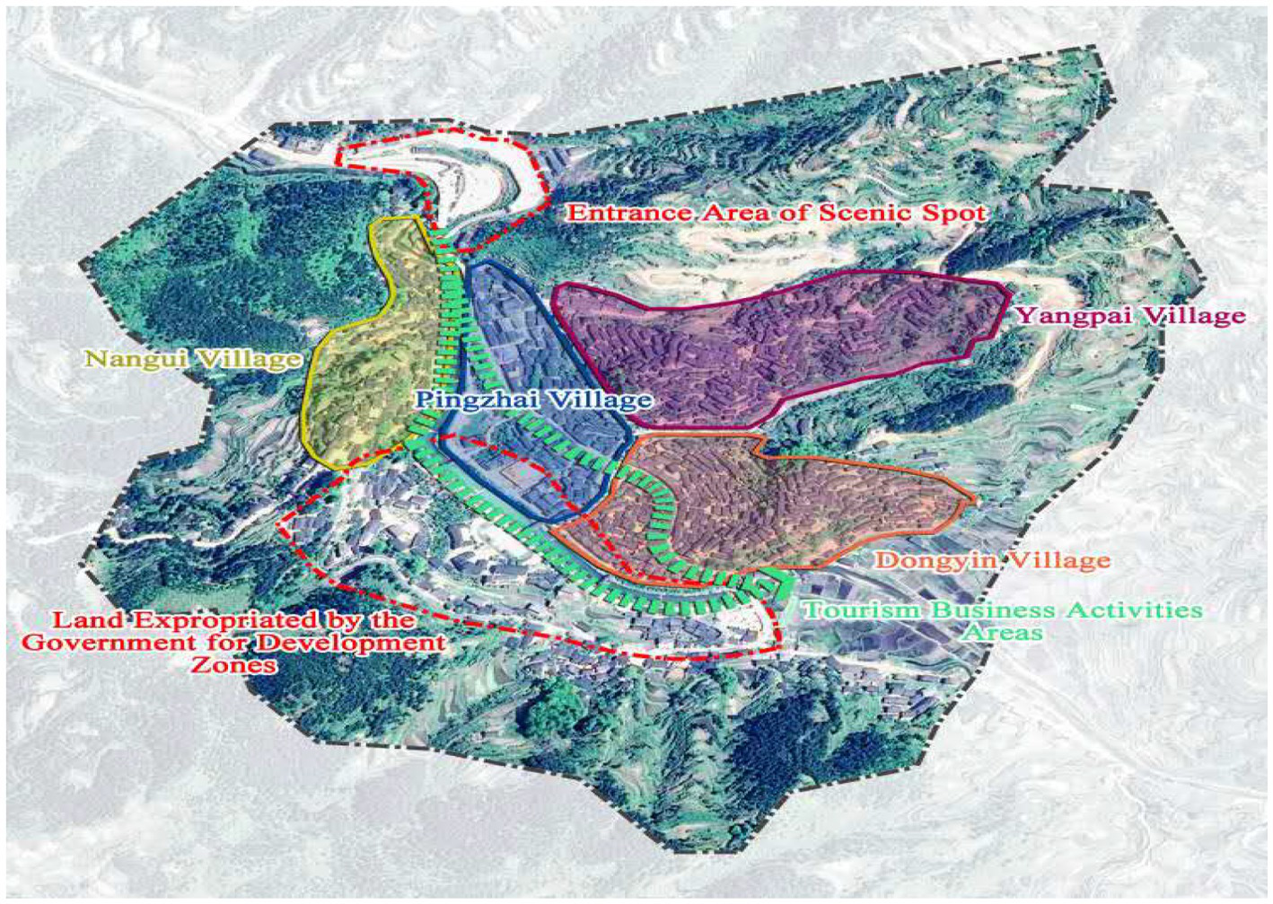 Xijiang Miao Village, locates in the Qiangdongnan Miao and Dong Autonomous Prefecture, Guizhou Province. The Miao, an ancient cultural group and now the fourth largest ethnic minority in China, lives primarily in the mountainous areas of Guizhou, Yunnan, Sichuan, and other provinces in the southwest. Some sub-groups of the Miao, most notably the Hmong, have migrated out of China into southeast Asia and other western countries. They have their own languages, religious beliefs, and other folks. As the largest Miao inhabited area in China, Xijiang village developed during the third migration of the Miao people and now has a history of about 2,000 years and 1,288 households with a total population of nearly 6,000 accounting for 98.5% Miao globally. It is the largest Miao majority region in the world. The entire Miao habitation was built in the mountains and along water with a magnificent view of layers of terraced buildings, the typical style of Miao architecture (see Figure 2). The settlement is built in a vertical structure, with four villages: Pingzhai, Dongyin, Nangui, and Yangpai. Pingzhai and Dongyin is closer to the core business district of the scenic spot compared with the others, and the village population is larger, tourism participation is more actively (see Figure 3).