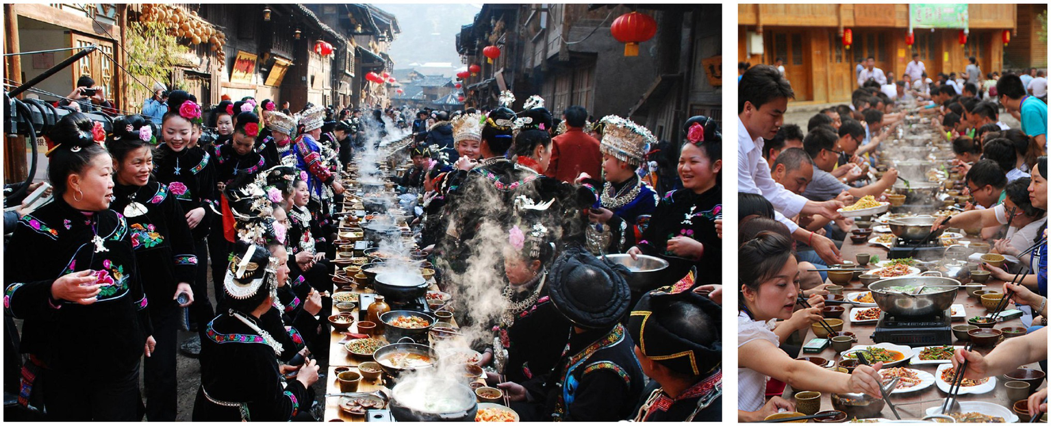 Long Table Banquet for villagers (left) and visitors (right; Source: The official website of Xijiang Miao Village: http://www.xjqhmz.com/).
