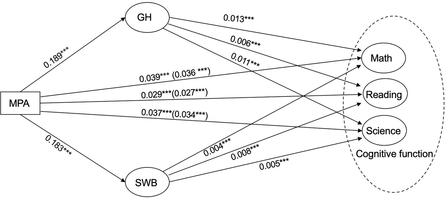 The estimation of standardized direct effects was reported in Table 5. MPA had significant positive effects on both GH and SWB. The path coefficient from MPA to GH was significant (.189, p < .001), and so was the path coefficient from MPA to SWB (.183, p < .001). That is, both GH and SWB were influenced by students’ MPA.
