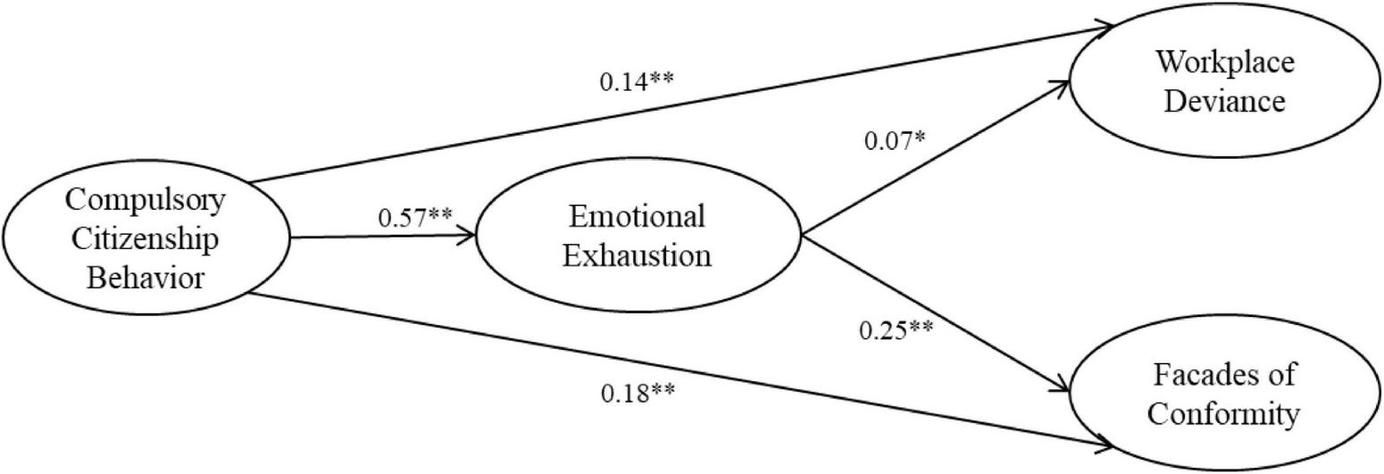 To ensure the rigor of this study, we constructed four variations of the mediation models for testing. Table 3 presents the model data. Alternative Model 1 was a complete mediation model in which CCB had no major effect on workplace deviance and facades of conformity, but where emotional exhaustion did have an effect on them. Alternative Model 2 was a partial mediation model in which CCB retained its primary effect on workplace deviance, and emotional exhaustion affected workplace deviance as well. Alternative Model 3 was a partial mediation model in which CCB retained its primary effect on facades of conformity, and emotional exhaustion affected facades of conformity as well. The optimal model (χ2 = 6.91, df = 1; RMSEA = 0.05; CFI = 0.99; and AGFI = 0.95) was selected as the theoretical model for this study.