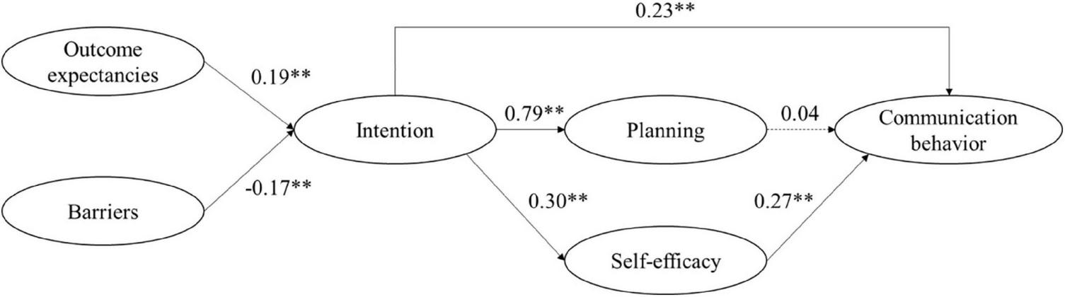 Figure 1. Path model derived from the HAPA model to establish associations between social-cognitive communication variables in an online HCW sample (Study 1). Coefficients are reported as unstandardized. Fit indices: χ2(df = 7) = 8.86, p = 0.263; CFI = 0.98, RMSEA = 0.05, CRMR = 0.06; **; p < 0.01.
