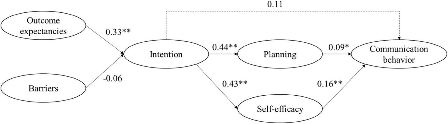Figure 2. Path model derived from the HAPA model to establish associations between social-cognitive communication variables in an obstetric HCW sample at two university hospitals (Study 2). Coefficients are reported as unstandardized. Fit indices: χ2(df = 7) = 19.00, p = 0.008; CFI = 0.77, RMSEA = 0.11, CRMR = 0.10; *p < 0.05; **p < 0.01.