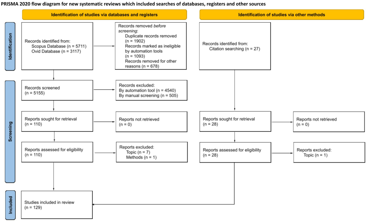Selection bias could possibly happen based on automation tool selection; however, we attempted to overcome this by carefully selecting relevant references during full-text reading. An additional N = 28 papers were manually included at this stage. Nine papers were excluded after full-text reading as considered out of topic. The final sample was N = 129 papers. The literature selection process is illustrated in the PRISMA flow diagram (Figure 1).