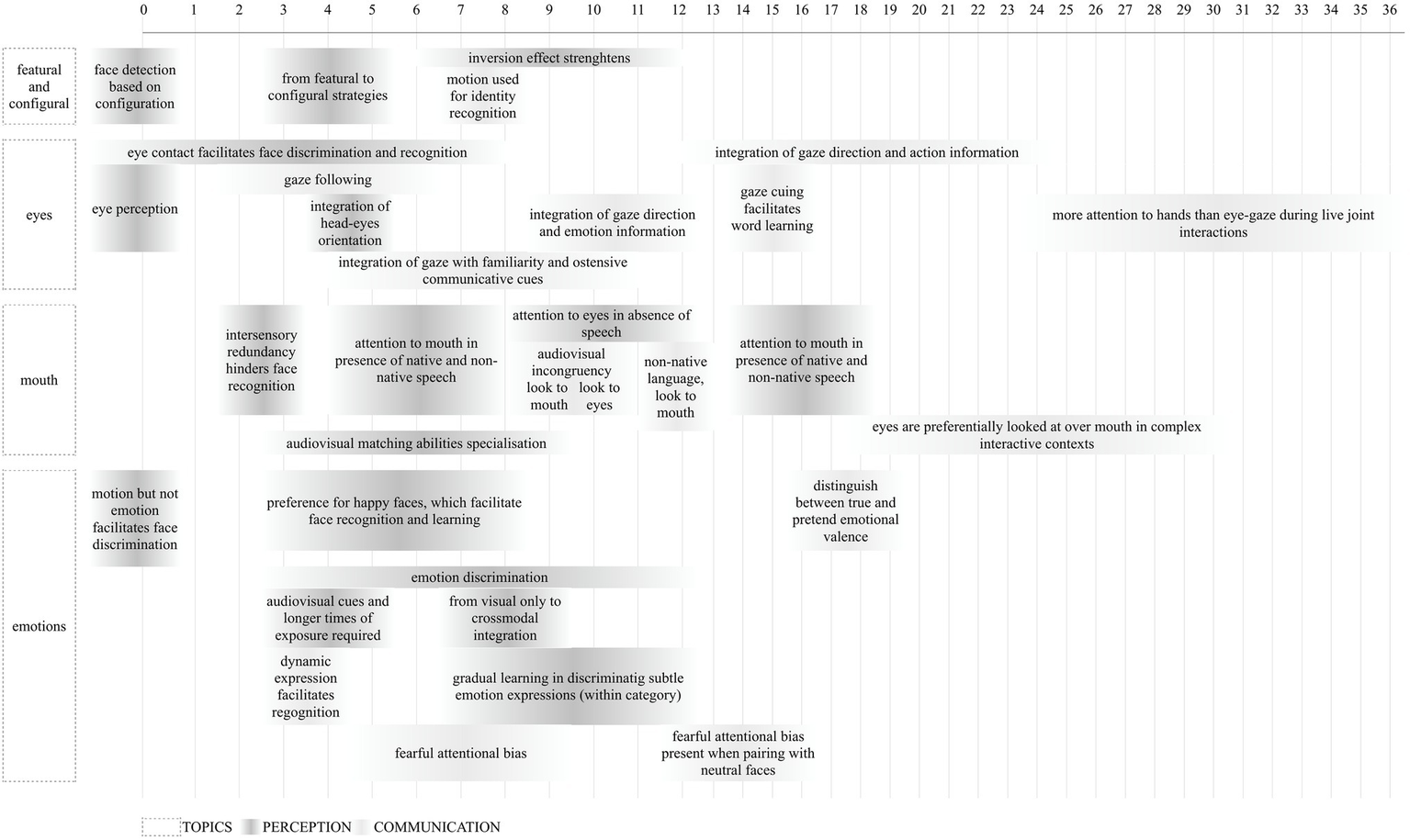 Taken together, this evidence suggests that a significant amount of time is spent looking at faces from early in life. While an increase in face looking with age is found when presenting infants with complex arrays in laboratory settings, naturalistic studies highlight that infants look less at faces as they grow. The motor skills required to direct attention to faces in real life situations, as well as the increasing importance of the adults’ hands and objects in social contexts could perhaps explain some of these contrasting results. In lab settings, when face exposure does not depend on postural motor skills, infants increasingly find images of faces more engaging than objects, especially if presented upright and with direct gaze. Thus, they gradually show a preference for the stimuli they are largely exposed to that will scaffold their face perception and social communication skills.