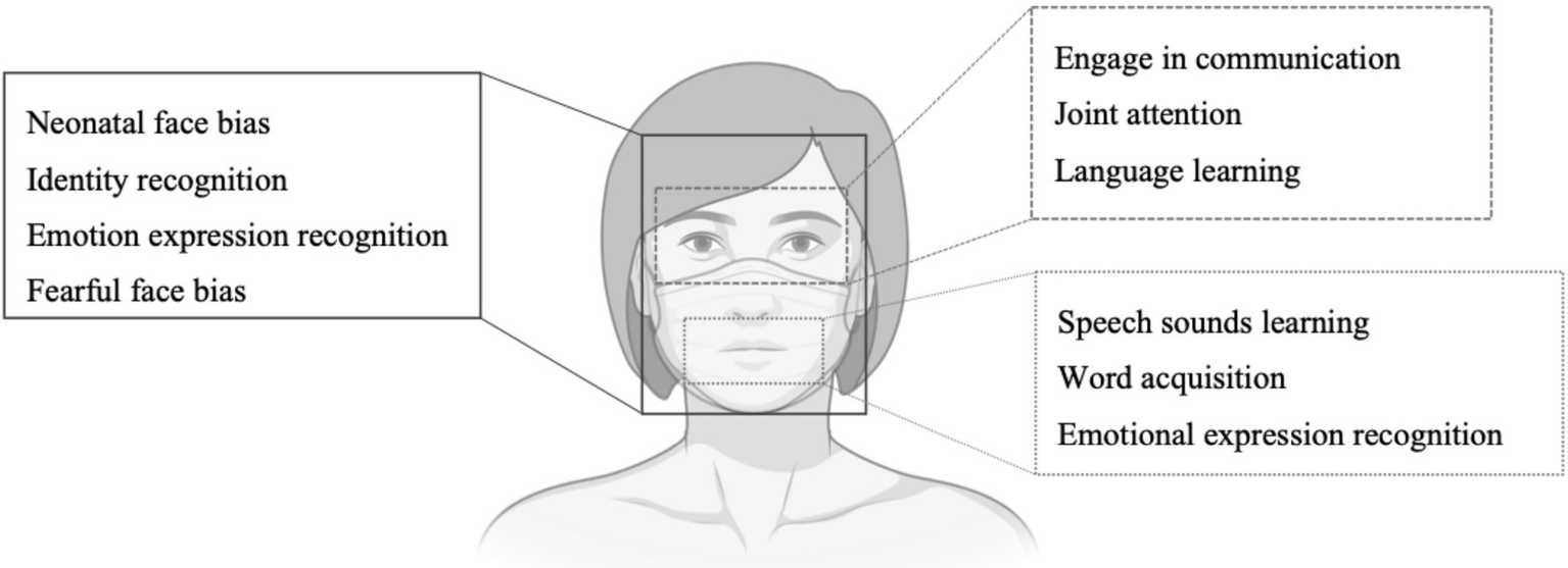 The development of face processing abilities partly relies on infants’ attention being focused on different facial features during sensitive periods for the development of functions and skills. Crucially, faces are one of the most prominent sources of social communication. Perceptual information from the face contributes to shape trajectories of individual socio-communicative skills. For instance, eye contact engages infants (Farroni et al., 2007) and gaze shifts support their attention allocation in the environment to learn from relevant stimuli (see, for example, Cetincelik et al., 2021), while information coming from others’ mouth supports language development (Lewkowicz and Hansen-Tift, 2012). Face masks change what features can be perceived, covering nose and mouth while leaving the eye region and forehead uncovered. To discuss whether and when face masks could interfere with infants’ socio-cognitive development, we examine published studies on infants’ focus on each facial feature and on how social and communicative skills are learnt from others’ faces.