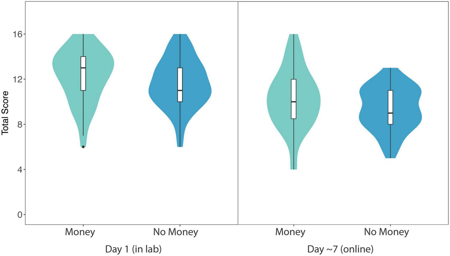 Violin plots showing probability density of total score data (within-subjects) for Monetary and No Incentive videos in Experiment 2 (in lab and online follow-up). Maximum score was 16 points (8 questions per video). Horizontal lines show median average score, surrounded by boxes indicating the interquartile range. Results revealed a significant effect of incentive (Monetary compared to No Incentive) on total score in both the lab experiment and the online follow-up.