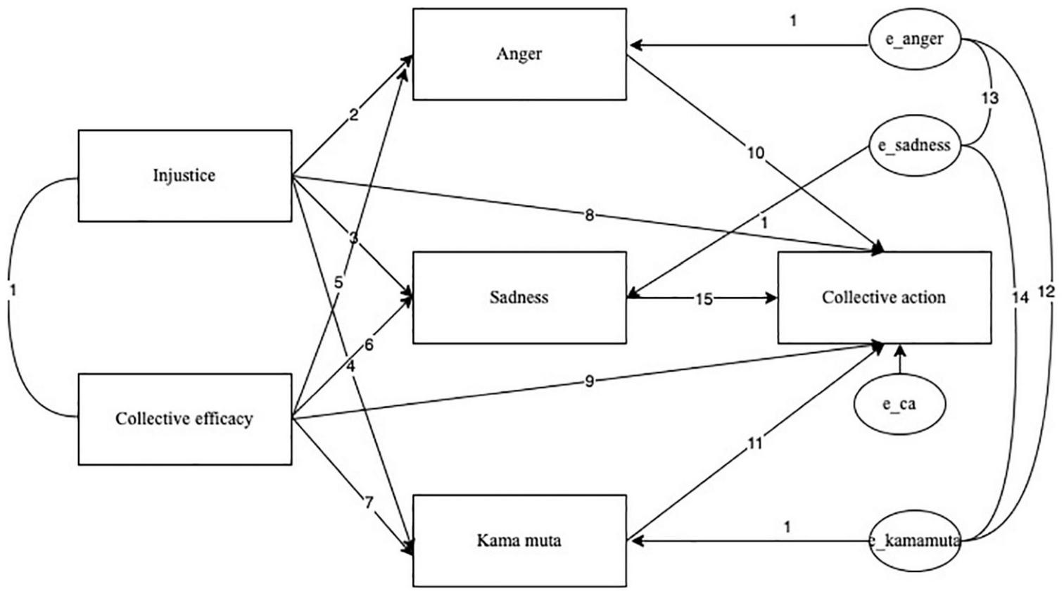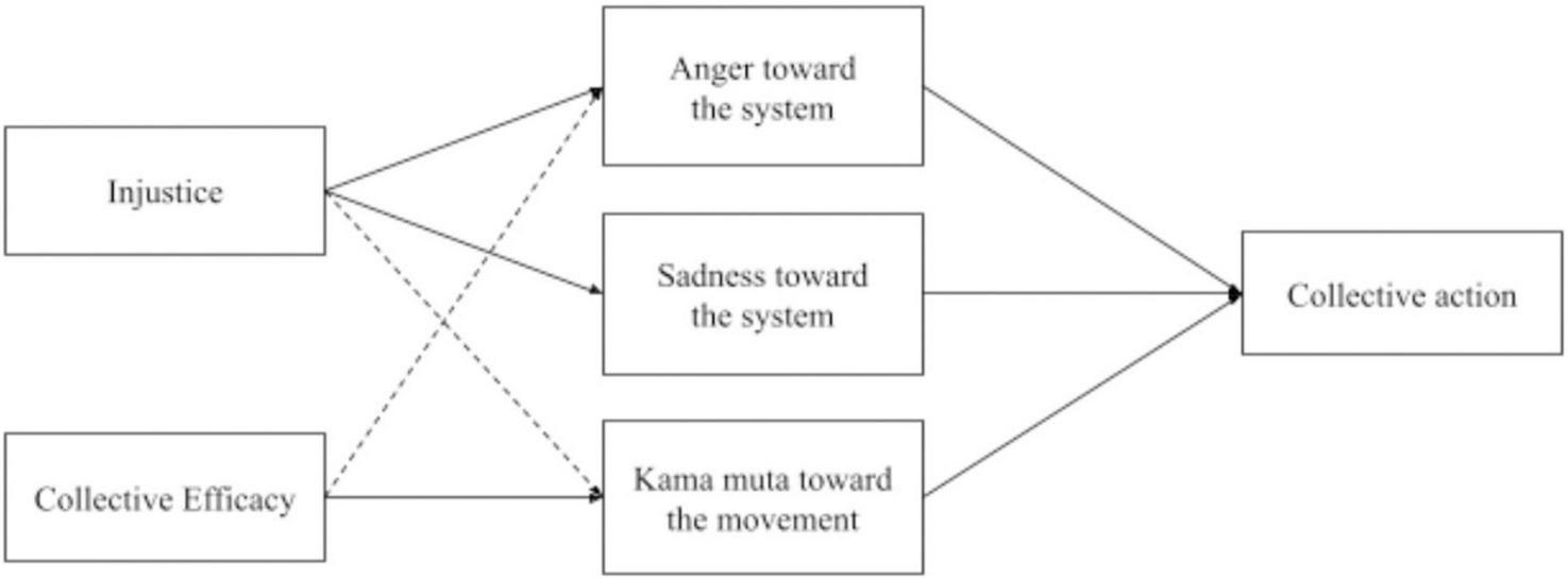 Fourth, we collected data on multiple targets of those emotions, both concrete in- and outgroups and more politically defined social entities (the BLM, and the system of racial inequality). In line with the findings by Landmann and Rohmann (2020), we hypothesized that kama muta toward the BLM movement mediates the relationship between collective efficacy and collective action intentions. Additional hypotheses, including the role of anger and sadness, were also included (see Figure 1).