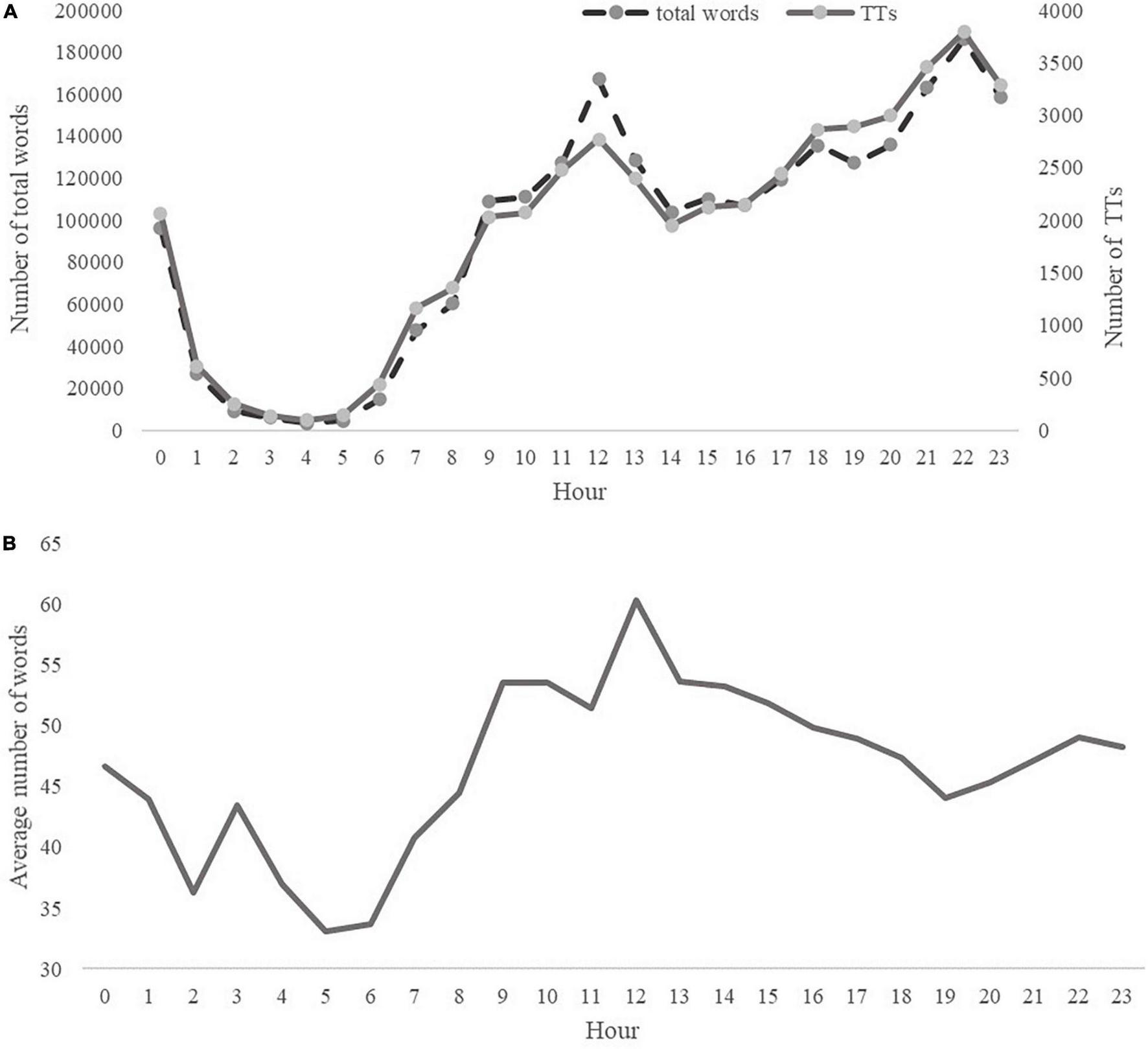 According to the total number of words and the number of TTs (Figure 1A), we can see a trough and two peaks on the curve. The trough was located between 1 a.m. and 6 a.m. when most students were sleeping. The two peaks were located at 12 a.m. and 10 p.m. The total number of words reached its highest point at 10 p.m.