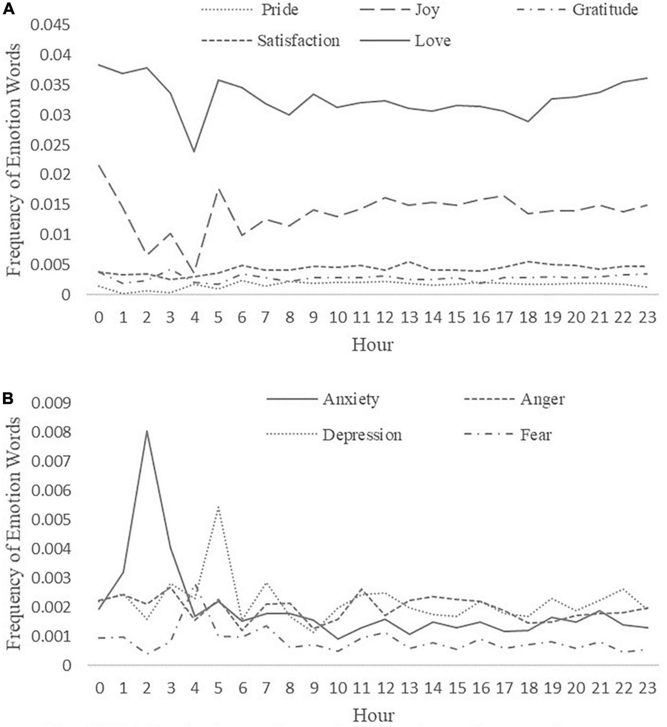 Then, we calculated the average frequency of emotion words for a certain category within a specific hour.