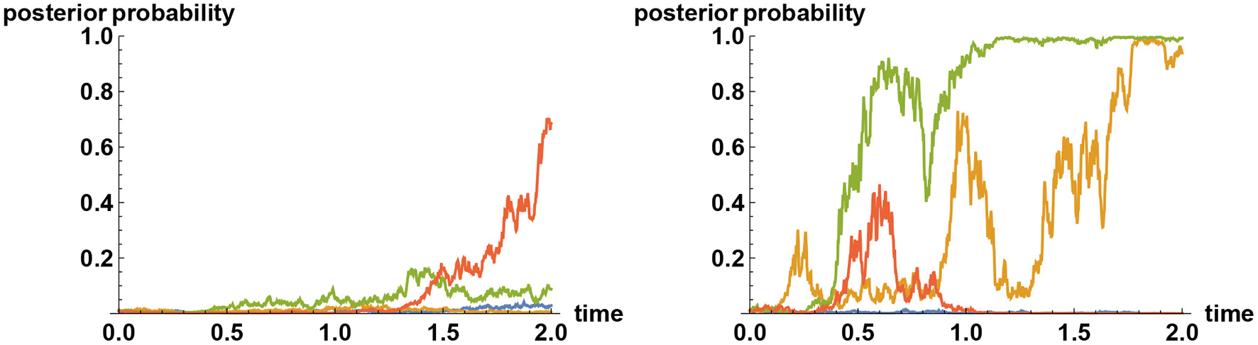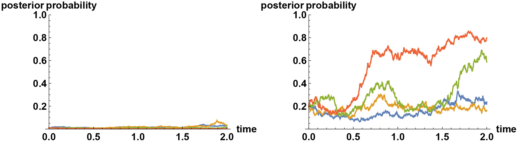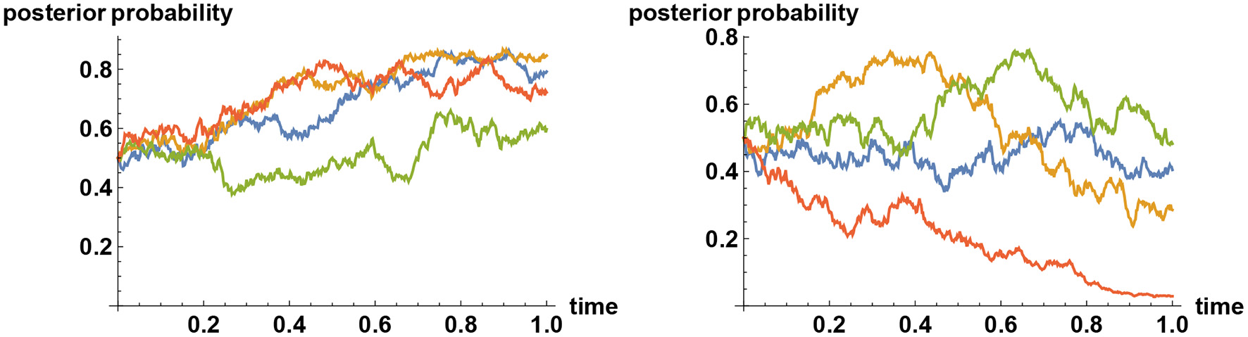 The mechanism behind the tenacious Bayesian phenomenon can be explained by means of communication theory. It has been remarked that for the uncertainty to reduce on average to a fraction of the initial uncertainty, a typical timescale required for gathering information is proportional to the inverse square of the information flow rate σ. More precisely, the timescale is given by (σΔ)−2, where Δ2 is the initial uncertainty, measured by the variance. Hence if the prior probability is highly concentrated at one of the alternatives, then Δ is very small, so typically it will take a very long time for the initial uncertainty to reduce by a significant amount. This is not an issue if the initial inference is the correct one. However, if the initial inference is incorrect, then there is a problem, for, the uncertainty will have to significantly increase before it can decrease again. As a consequence, having a very high prior weight on any one of the alternatives means it is difficult to escape from that choice even if ultimately it is not the correct one, because each alternative acts like an attractor. Sample paths illustrating this effect are shown in Figure 3.