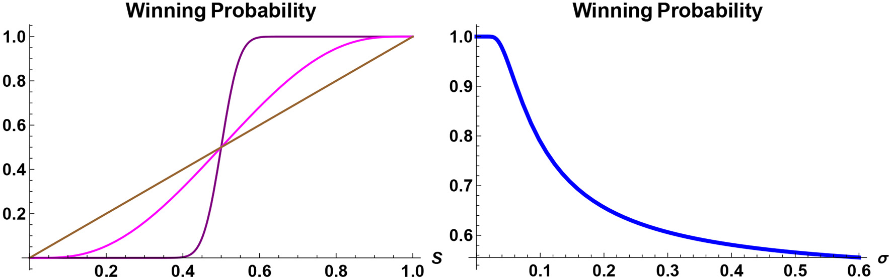 Probability of winning a future election. The winning probability of a candidate in a two-candidate electoral competition, to take place in 1 year time, is plotted. On the left panel, the probabilities are shown as a function of today's support rating S for two different values of the information-flow rate: σ = 0.15 (purple) and σ = 0.95 (magenta). If today's poll S were an indicator for the winning probability, then it would be given by a straight line (brown), but in reality the probability of winning a future election of a candidate, whose current support rate is S>50%, is always greater than S. On the right panel, the winning probability is shown as a function of the information-flow rate σ of a candidate whose support rate today is S = 52%. If the candidate is leading the poll, then the best strategy is to reveal as little information relevant to the election as possible.