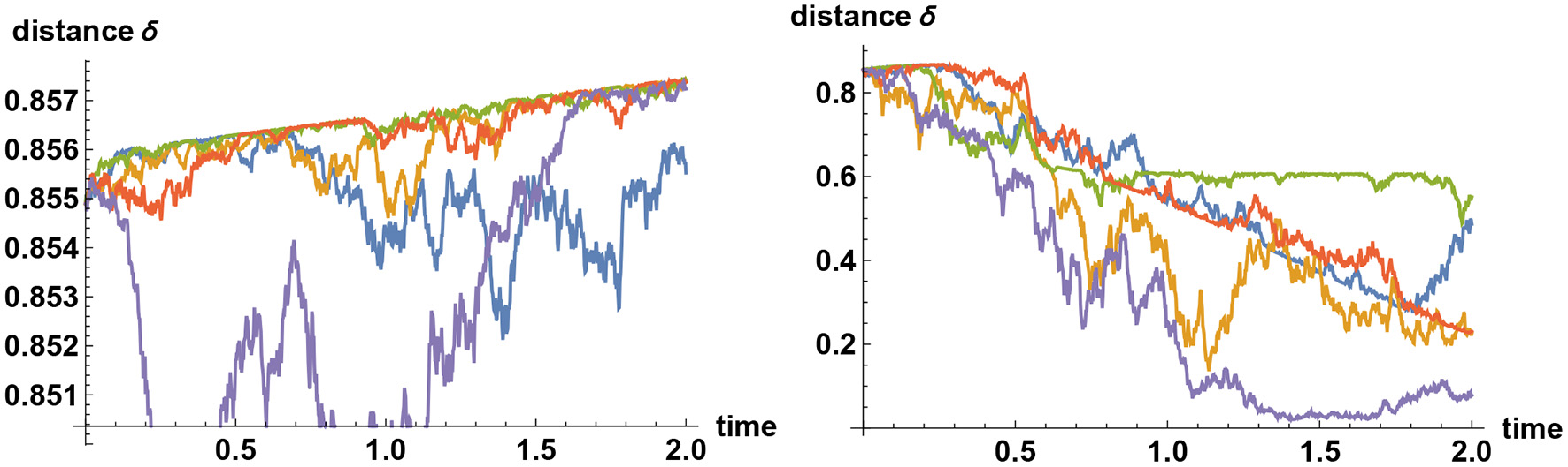 Separation distance under Bayesian updating. The polarity, or distance δ of two decision makers, when they are provided with an identical set of noisy information, has a tendency to increase under the Bayesian updating, even though on average it decreases in time. Five sample paths are shown here for two different choices of σ. On the left panel the information flow rate (signal to noise ratio) is taken to be σ = 0.2. Simulation studies (not shown here) indicate that in this case the upward trend persists for some 40 years in about 50% of the sample paths, and the separation distance is typically reduced to half of the initial value after about 100 years. When the information flow rate is increased eleven-fold to σ = 2.2, polarized Bayesian learners are forced to converge a lot quicker, as shown on the right panel, where the separation is reduced to half of its initial value typically within 2 years.