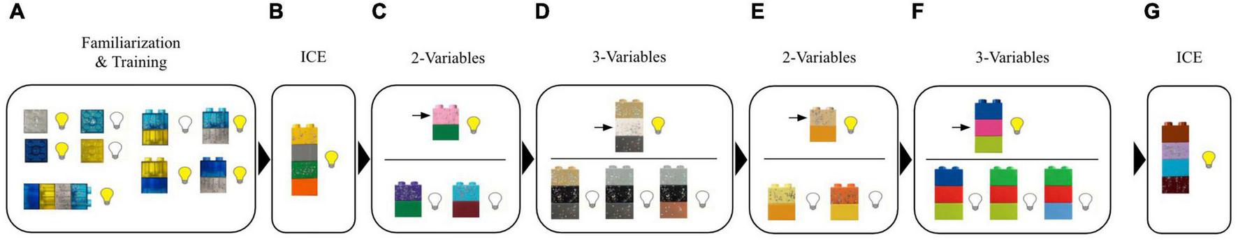 The lightbox machine (based on the blicket detector, Gopnik and Sobel, 2000) was a custom-built wooden box (30 × 20 × 15 cm) with an LED strip around the top that was controlled by the experimenter via foot pedal. Forty-eight Lego Duplo bricks in 30 unique colors and patterns were used to activate the machine (see Figures 1A–G). Seven sets of bricks were used: four bricks for familiarization and training (Figure 1A), two sticks with four bricks each for the ICE trials (Figures 1B,G), two sets of three sticks with two bricks each for the two-variable CVS trials (Figures 1C,E), and two sets of four sticks with three bricks each for the three-variable CVS trials (Figures 1D,F). The bricks in all sticks were glued together so that they could not be separated.