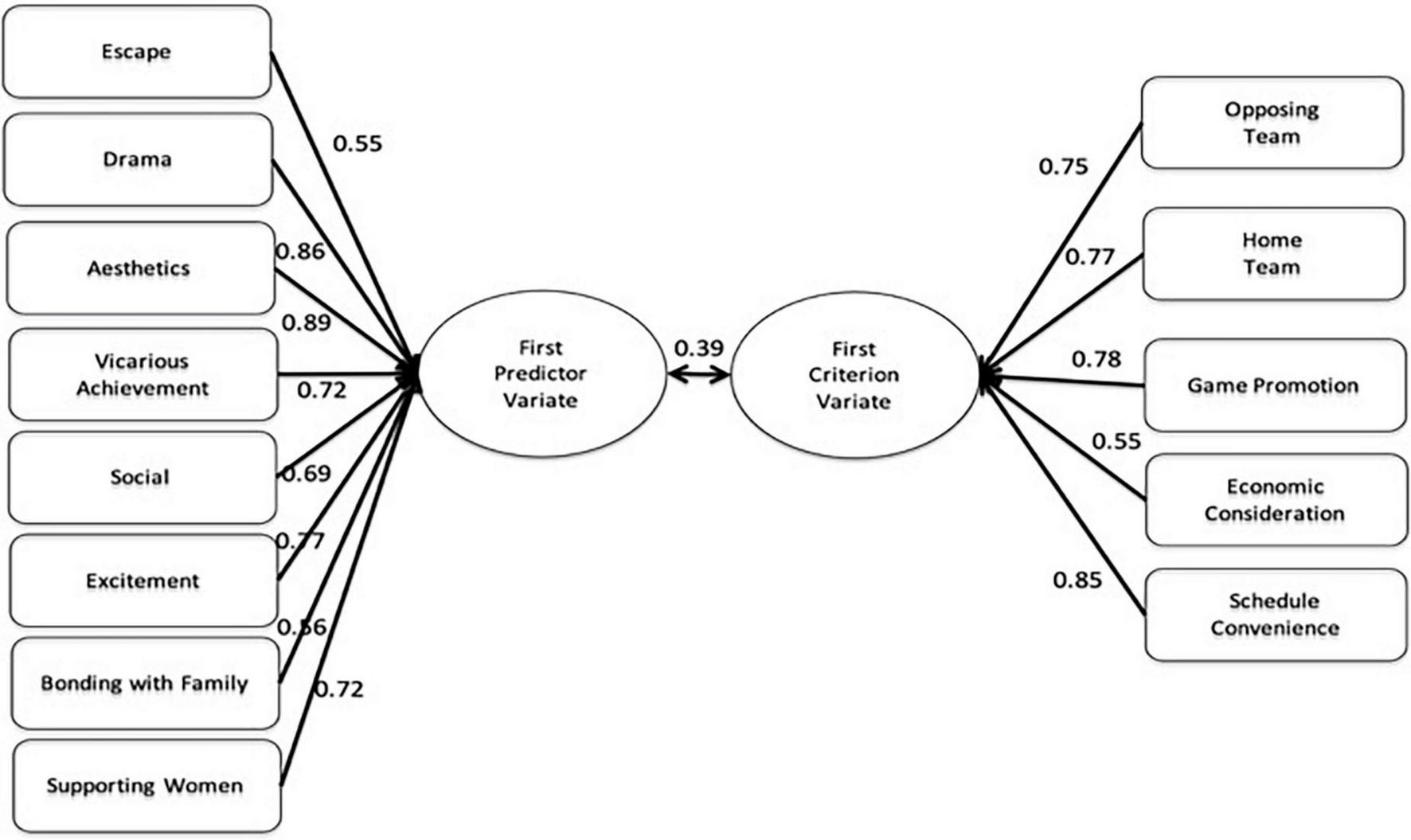 Through canonical correlation analysis, this study examined the multivariable relation between pull and push factors. The findings revealed two significant functions, referred to as the “I-Want-Everything-Consumer” and “Achievement Seekers.” As the name indicates, the first I-Want-Everything-Consumer function relates to all eight fan motives—aesthetics, social interaction, drama, vicarious achievement, excitement, supporting women’s sports, escape, and bonding with family—which loaded relatively highly (λ ranged from 0.55 to 0.89) on the predictor variable. With respect to the criterion variable, opposing team, home team, game promotion, economic consideration, and schedule convenience, all had relatively high loadings (λ ranged from 0.55 to 0.85) with the same sign and thus were correlated positively with each other.