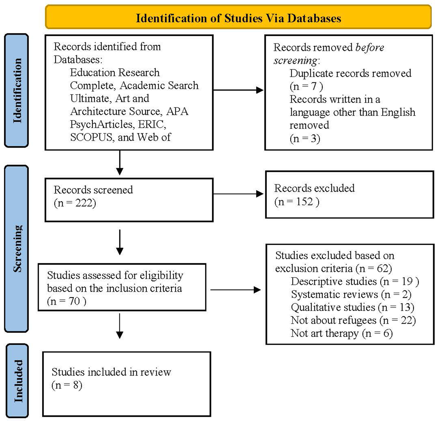 A systematic review of research related to the use of art therapy with traumatized refugee children, adolescents, and adults was conducted using Preferred Reporting Items for Systematic Reviews and Meta-Analyses (PRISMA; Page et al., 2021). Peer-reviewed studies were identified through the following Boolean search terms entered in Education Research Complete, Education Research Complete, Academic Search Ultimate, Art and Architecture Source, APA PsychArticles, Web of Science (WOS), Scopus, and ERIC databases: (“trauma,” OR “PTSD,” OR “post-traumatic stress disorder,” OR “traumatized children”) AND (“refugee*” OR “forced migration”) AND (“art therapy” OR “art”). The Boolean terms were entered into the mentioned databases and the search process continued across the three PRISMA phases (see Figure 1). The search was filtered to include articles published in English between the years 2010 and 2020. Two professors of special education reviewed the keywords and agreed on the list of terms that can be used during the search procedure. For relevance to the current review, the abstracts, as well as full-text peer-reviewed articles were obtained and screened. The systematic review focuses on experimental studies conducted from 2010 to 2020. Given that there are a limited number of studies on art therapy with refugee children, this topic was explored at a broader level with a focus on adults, adolescents, and children refugees.