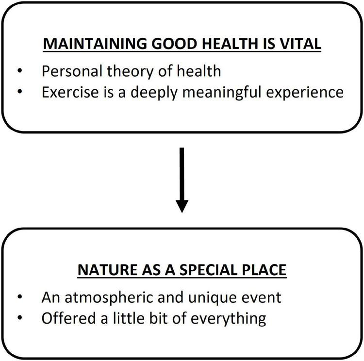 Following data analysis, two superordinate themes were constructed to resemble participant experiences. “Maintaining good health is vital” reflected participants’ personal theory of health and their perceived benefits of exercise. “Nature as a special place” reflected the atmospheric characteristics of the event, including the pre-event set-up and the actual running event itself.