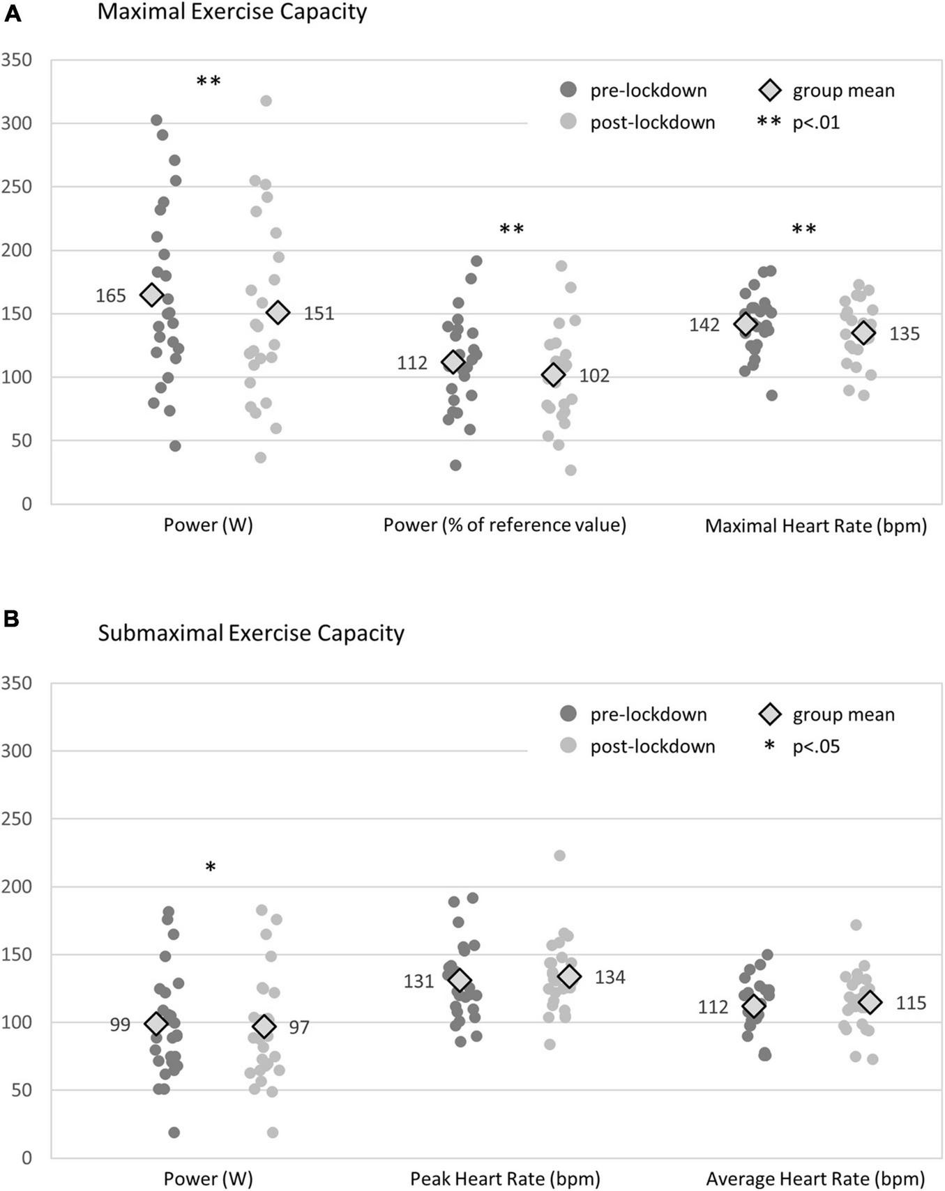 Two participants were excluded from analysis of cardiorespiratory fitness data, due to subsequent diagnosis of new non-cardiac complaints limiting exercise performance. The median (IQR) time period between participants’ most recent pre-lockdown maximal cycle ergometer tests and the beginning of lockdown was 6 (5, 9) months. The median (IQR) time period between pre- and post-lockdown maximal cycle ergometer tests was 11 (10, 20) months. The median (IQR) time period between pre-lockdown submaximal cycle ergometer training session and the beginning of lockdown was 1 (1, 2) week. The median (IQR) time period between pre- and post-lockdown submaximal cycle ergometer training sessions was 5 (5, 7) months. With regard to individual exercise capacity, 14 (56%) participants had worsened, 10 (40%) were unchanged, and 1 (4%) had improved post-lockdown. FRS for recurrent cardiovascular events had worsened in 7 (26%), remained unchanged in 12 (44%), and improved in 8 (30%) participants. At group level, maximal and submaximal exercise capacity had significantly reduced, whereas CVD risk factors remained unchanged from pre- to post-lockdown (Table 2 and Figure 2).
