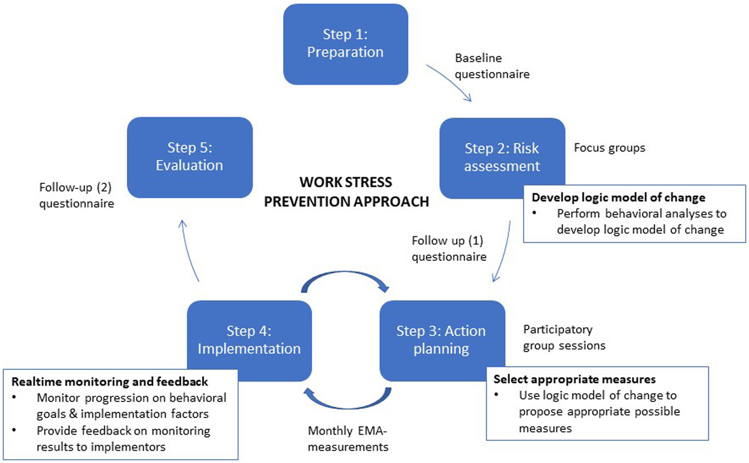 This paper outlines a work stress prevention approach that will be conducted in primary education in Netherlands and evaluated in a controlled trial. The approach consists of five steps: (1) preparation, (2) risk assessment, (3) action planning, (4) implementation, and (5) evaluation (see Figure 1). As part of the risk assessment (step 2), a behavioral analysis is carried out to build a logic model of change. This logic model is used to select measures for action planning (step 3). During implementation (step 4), progression on target behavior and implementation factors are monitored and feedback is provided to implementors. After implementation, the effect of the approach and the implementation process are evaluated (step 5).