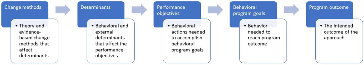 Based on the identified risk factors, a behavioral analysis is carried out by the research team to develop a logic model of change that reflects the situation for all four schools (see Figure 2). First, the intended outcome of the intervention is formulated (e.g., work stress reduction among primary school workers). Second, this intended outcome is translated in terms of behavior by determining what behavior is needed to prevent work stress among workers in primary education (e.g., keep a healthy energy balance, carry out work tasks within regular working hours). These are the behavioral program goals the measures (that are selected in step 3 action planning) should focus on. Third, behavioral actions (performance objectives) that are needed from different actors to accomplish the behavioral program goals are specified (e.g., monitor workload and exchange expectations with colleagues). Fourth, behavioral and external determinants of these behavioral actions are identified that are a precondition for the behavioral actions to occur (e.g., motivation, self-efficacy, and awareness). Last, the research team selects suitable theory- and evidence-based change methods (e.g., guided practice and goal setting) aimed at the identified determinant, based on behavioral change literature (Bartholomew Eldredge et al., 2016). The advisory board and the school principals are consulted to check the (preliminary) results of the behavioral analyses (e.g., do they reflect practice?).
