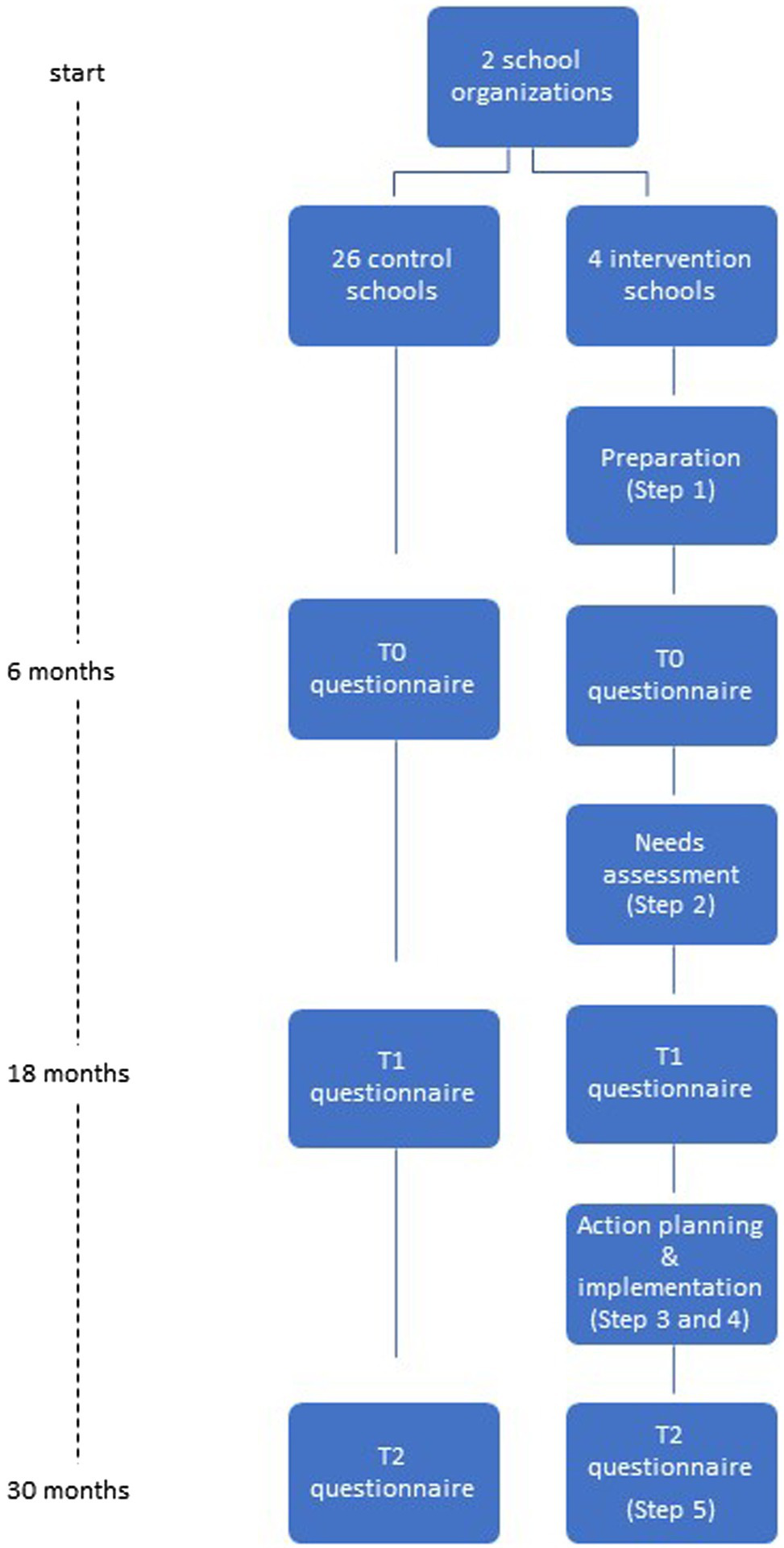 The effects of the work stress prevention approach are evaluated in a controlled trial (see Figure 3). As part of the effect evaluation online questionnaires are sent out at baseline (after preparation), 1 year (after needs assessment), and 2 years follow-up (after implementation) to all workers of the intervention and control schools.