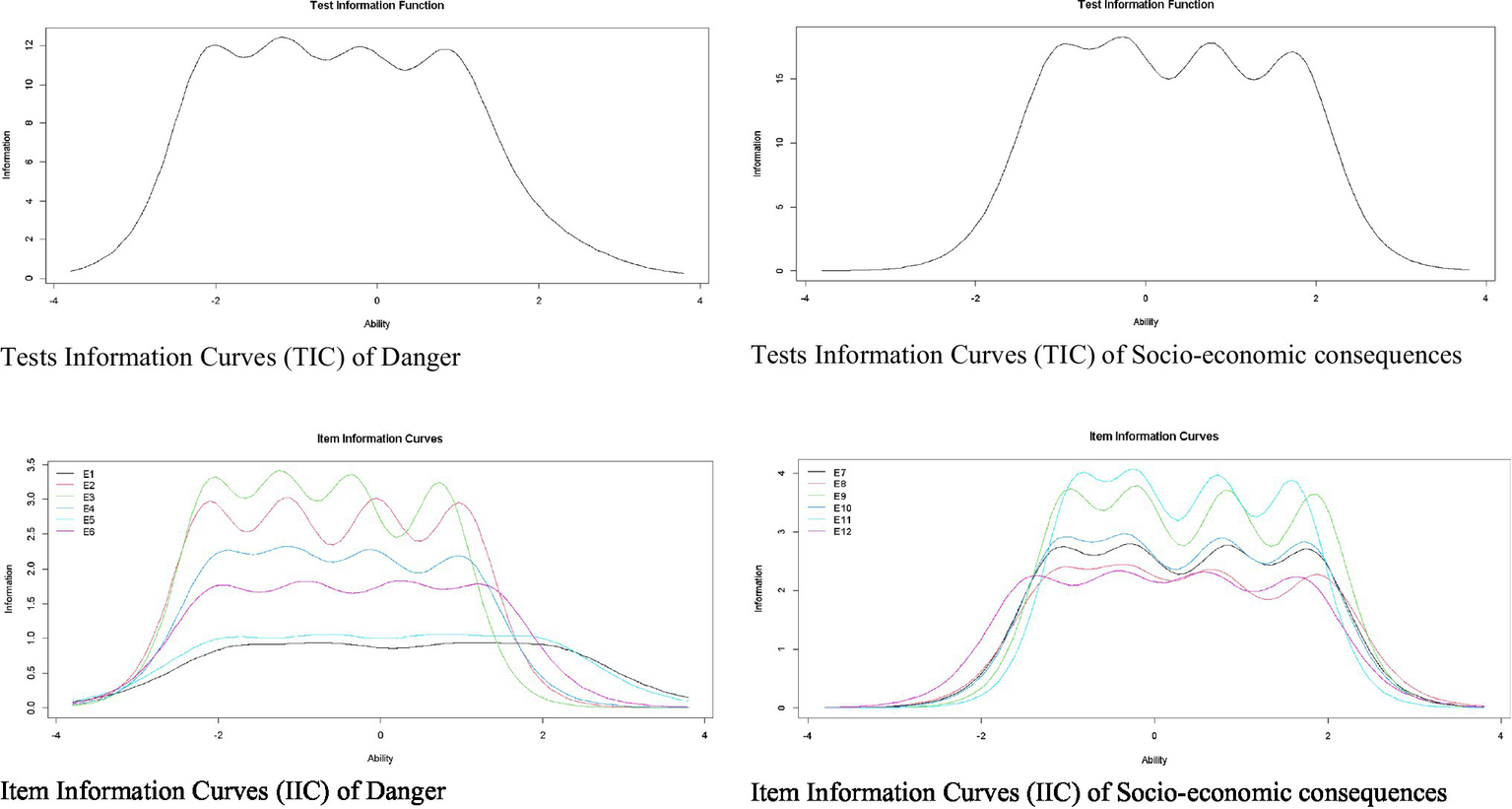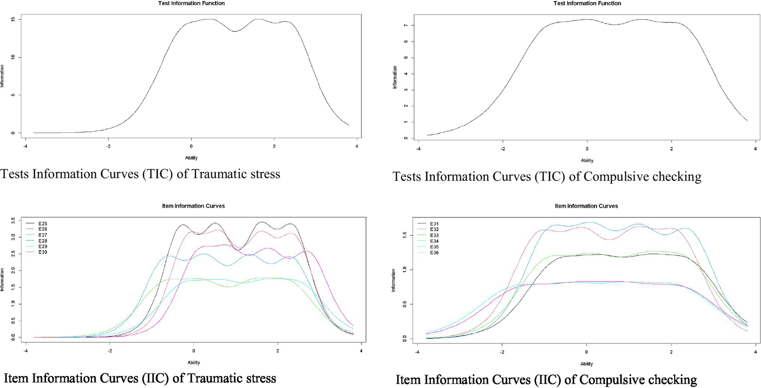 Item Response Theory -based analyses were performed with a Graduated Response Model (GRM; Samejima, 1997) specifically an extension of the 2-parameter logistic model (2-PLM) for ordered polytomous items (Hambleton et al., 2010). For model fit, the C2 test developed for ordinal items (Cai and Monroe, 2014) was used. The following adjustment criteria were used: RMSEA ≤ 0.05 (Maydeu-Olivares and Joe, 2014) and SRMSR ≤ 0.05 (Maydeu-Olivares, 2013). CFI and TLI values were considered using the same adjustment criteria (≥0.95) used in SEM models (Lubbe and Schuster, 2019).