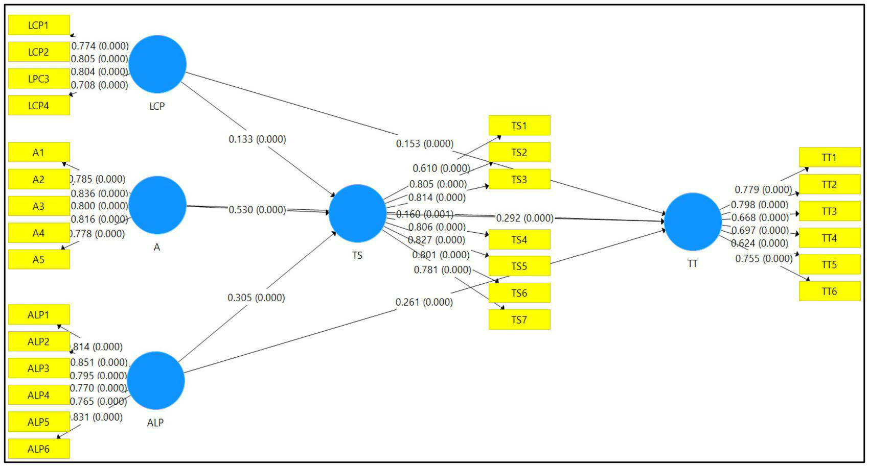 The three DIF constructs directly influence TT. Furthermore, LCP exhibits a significant positive connection with TT (β = 0.153, p < 0.05), indicating that hypothesis H1.1 is supported. Likewise, authenticity has a substantial positive influence on TT (β = 0.160, p < 0.05), supporting hypothesis H1.2. ALP has a beneficial effect on the TT (β = 0.261, p < 0.05), confirming hypothesis H1.3. LCP displays a substantial positive connection with TS (β = 0.133, p < 0.05), indicating that hypothesis H2.1 is supported. Furthermore, there is a substantial positive association between authenticity and TS (β = 0.530, p < 0.05), which supports hypothesis H2.2. ALP exhibits a substantial positive connection with TT (β = 0.305, p < 0.05), supporting hypothesis H2.3. Similarly, TS displays a substantial positive connection with TT (β = 0.292, p < 0.05), implying that hypothesis H3 is accepted.