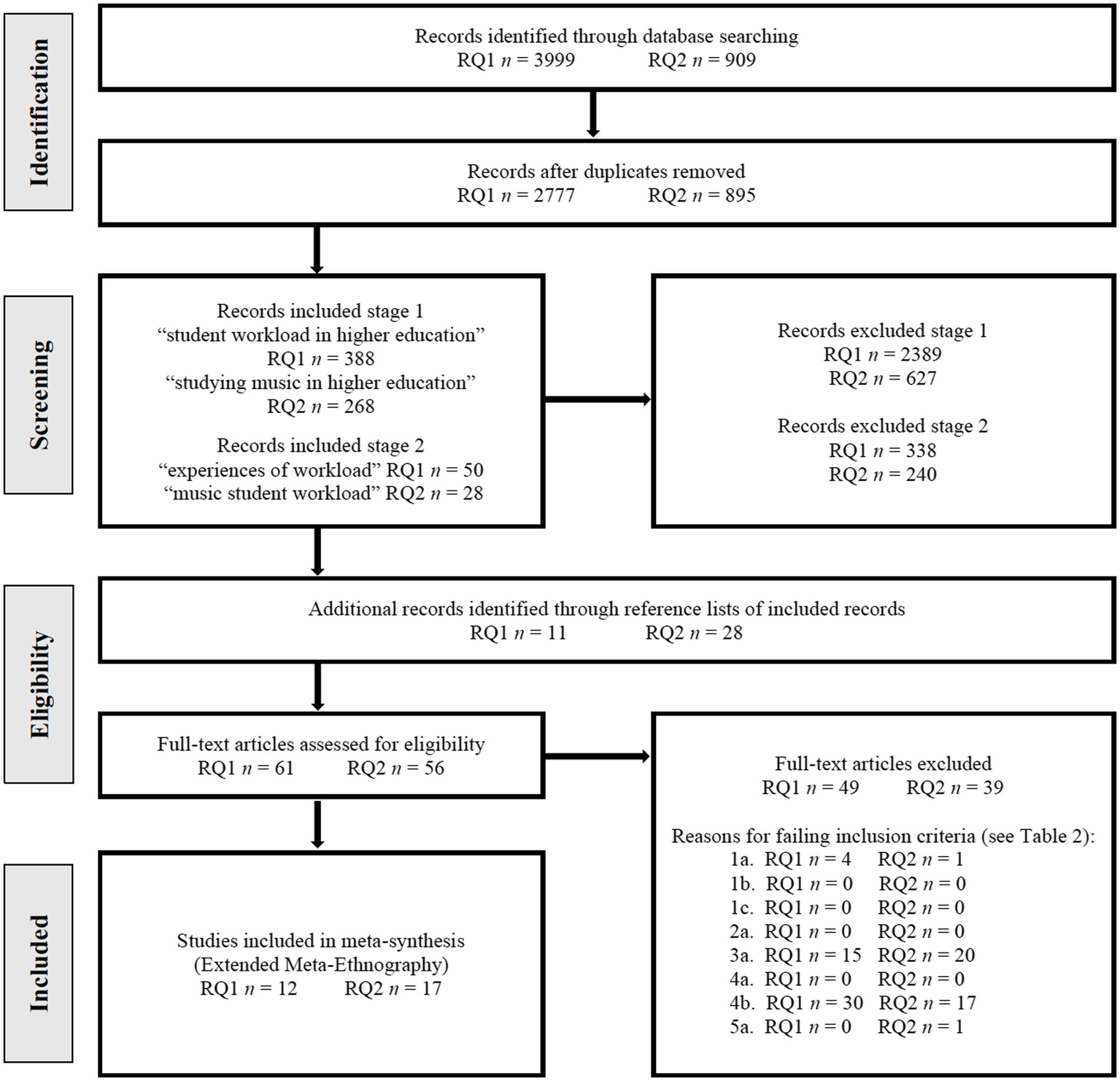 | 2. Music students’ experienced workload in higher education: A systematic review and recommendations for good practice (Jääskeläinen et al., 2022b) | Systematic literature review | 1. What factors have an impact on students’ experienced workload? | Systematic literature search | 12 studies on students’ experiences of workload in higher education and 17 studies on music students’ experiences of workload in studying music | Extended meta-ethnography | A total of 24 recommendations for good practice to |