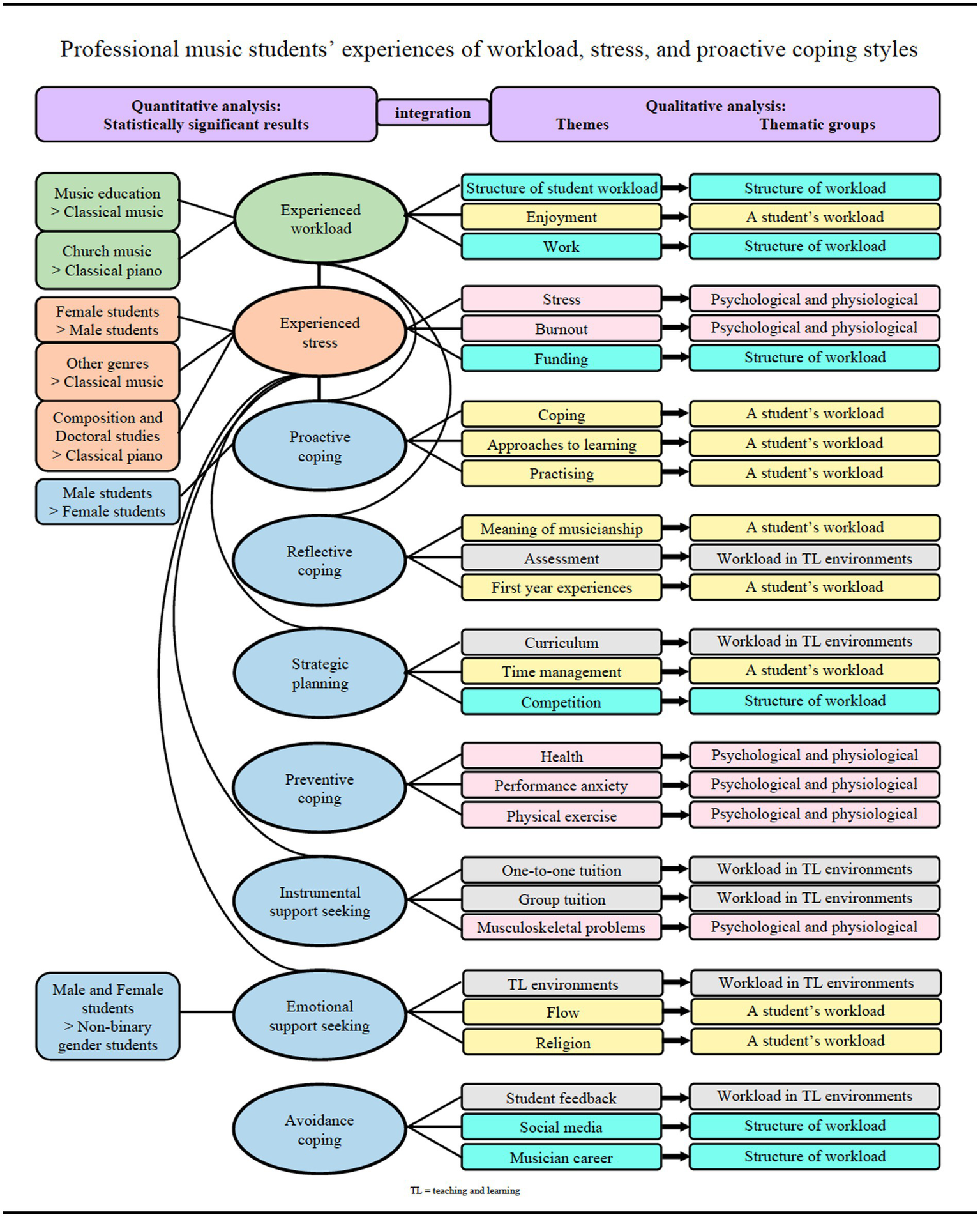 In the second empirical study (i.e., Jääskeläinen et al., 2022a), Figure 5 shows the integration of the qualitative findings with the quantitative results. The results indicate that there are statistically significant differences among music students in different genre groups and study programs in relation to experienced study workload; in genders, genre groups, and study programs in relation to experienced stress; and in genders in relation to the use of proactive coping style. Music students’ study workload is a significant predictor of stress. However, proactive coping and strategic planning can be used to reduce this stress, because they predict stress negatively. Professional music students have their own issues and ways to cope with workload and stress concerning, for example, working alongside studying, competing with peer-students, handling information on social media, and finding support for music-specific physical and psychological problems. This participant’s quotation illustrates a music student’s experience in using an emotional support-seeking coping style: