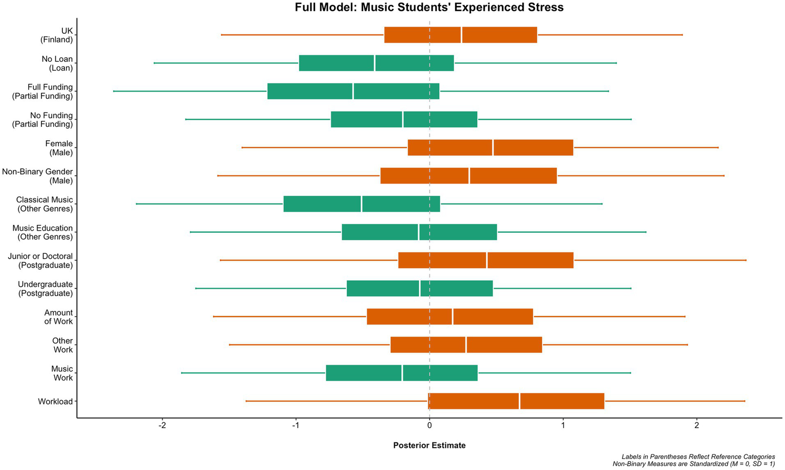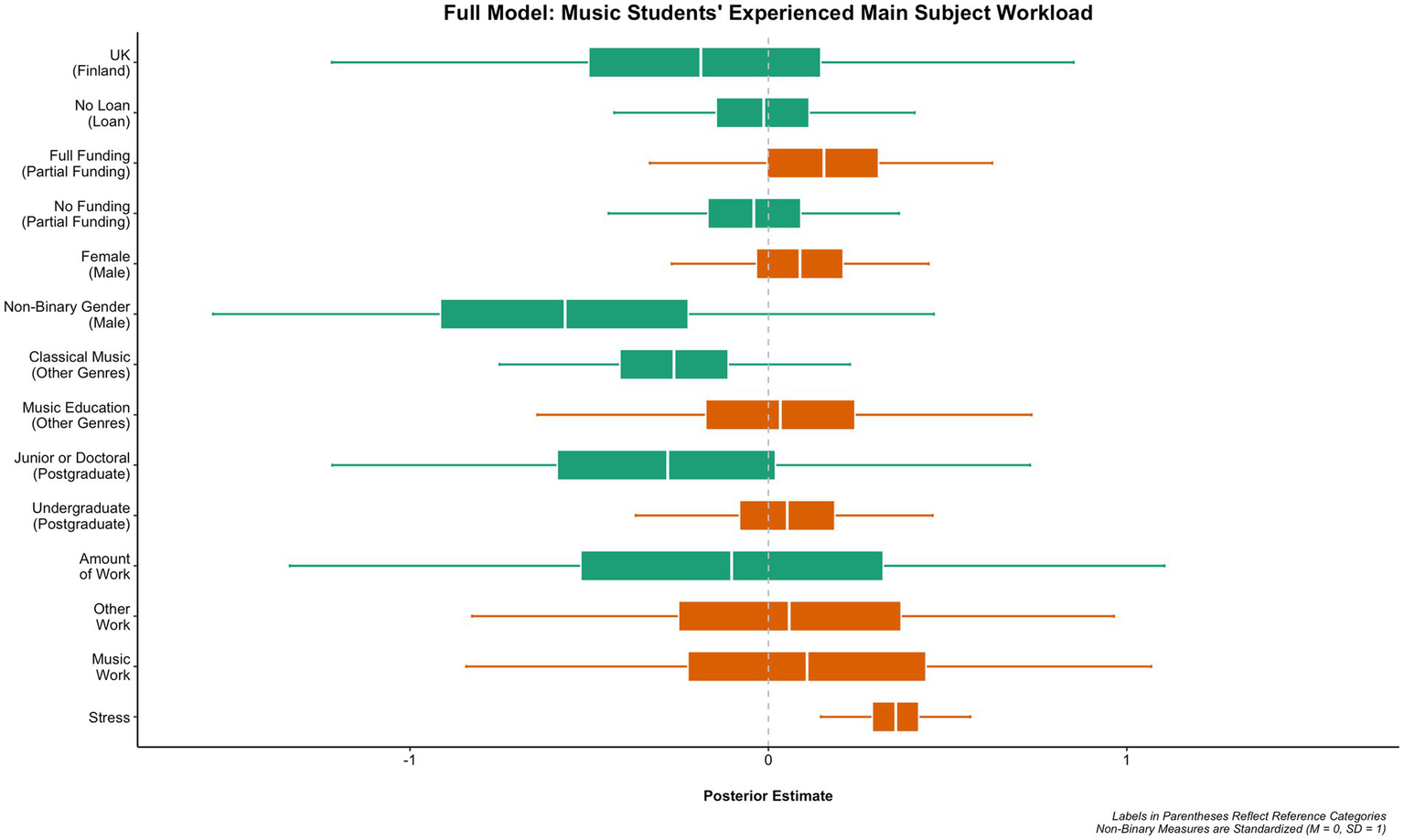 In the third empirical study (i.e., Jääskeläinen et al., 2020), Figure 6 shows the full model of music students’ experienced main subject workload, which indicates that, when connected to these characteristics of livelihoods, stress was the strongest predictor of workload. There was also an effect for funding, such that music students with partial funding or no funding at all were less likely to report experiencing workload than students with full funding. Work related to music had a greater effect than work not related to music, but the total amount of work undertaken alongside a student’s studies had a negligible effect on workload. Female music students were likely to report experiencing more workload than male or non-binary gender students. The level of the university studies, in general, had a relatively small impact on the results; however, undergraduate music students were likely to report experiencing more workload than postgraduate students or junior and doctoral students. The music genre studied had little influence on the level of experienced workload, although studying music education had a greater effect compared to other genres, whereas the classical music genre had a negligible effect. Figure 7 shows the full model of music students’ experienced stress, which indicates that, when connected to the characteristics of livelihoods, music students in the United Kingdom are more likely to report experiencing stress than music students in Finland. Workload was the strongest predictor of stress in the full model. There was also a noticeable effect for gender, such that female music students were more likely to report experiencing stress than male students. With the non-binary gender, there was a positive effect on stress, which was contradictory to the negligible effect on workload in the previous full model. Both work not related to music and the total amount of work undertaken alongside studying had a small effect, but work related to music did not have an influence on stress. Junior or doctoral music students were much more likely to report stress than postgraduate students or undergraduate students, which contradicts the full workload model, in which being an undergraduate student had more influence on workload. The use of loans had no effect on stress (nor on workload in the previous model). This participant’s quotation illustrates a music student’s workload experience relating to teaching and learning environments: