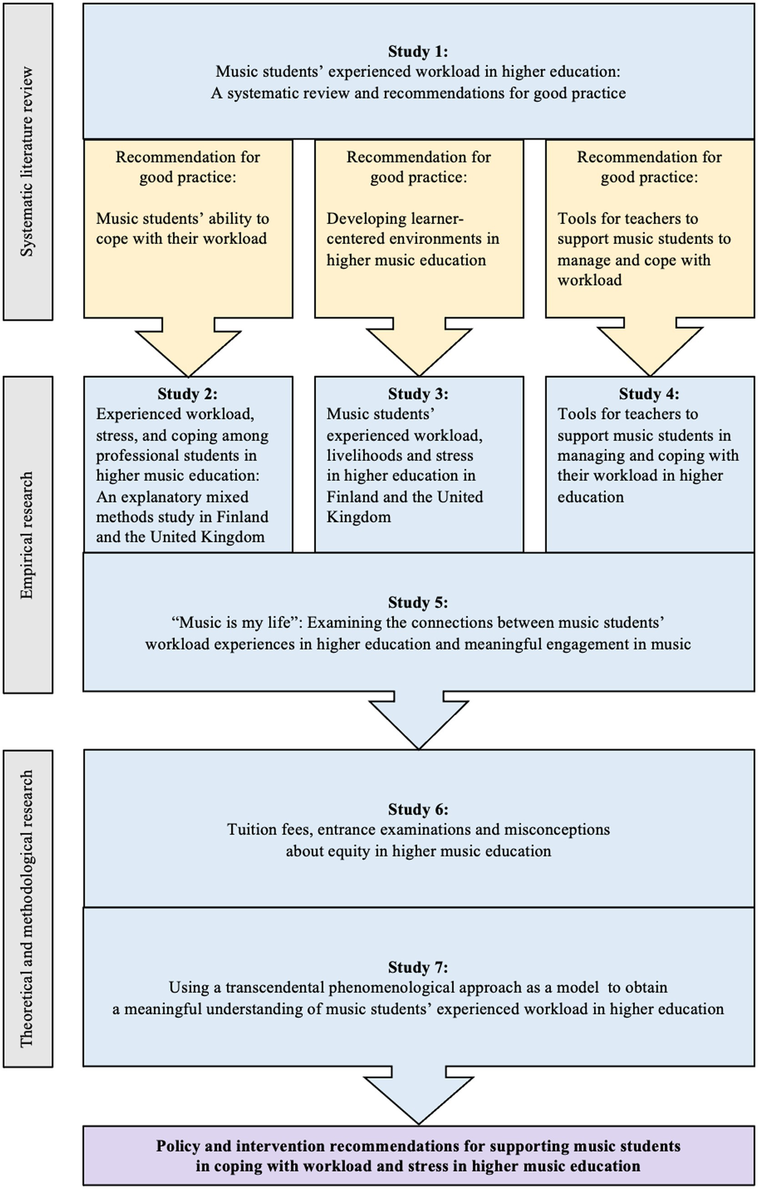 Evidence-based policies are needed to support students as they cope with their experiences of workload and stress in higher music education. This subject was explored in the Music Student Workload Project as a collaboration between Finland and the United Kingdom in seven studies: (1) a theoretical study scrutinizing diverse higher music education systems in connection with equality and cultural reproduction; (2) a systematic review mapping international research on music students’ workload; (3) a methodological study discussing the transcendental phenomenological approach as a method for obtaining a meaningful understanding of music students’ experiences in higher education; (4) a qualitative study exploring music students’ workload experiences in connection with their meaningful engagement in music; (5) a mixed-method study shedding light on music students’ proactive coping styles in connection with workload and stress; (6) a mixed-method study examining music students’ experienced workload, stress, and livelihoods; and (7) a qualitative study exploring teachers’ ways of supporting music students’ workload and stress. The meta-narrative synthesis was conducted by triangulating the key elements of these studies to generate four actionable policy and intervention recommendations to inform educational policies and practices for supporting students in coping with workload and stress in higher music education: (1) support music students’ proactive coping skills; (2) find solutions to the unequal workload and stress experiences between low-income and well-off students, different genders, and different study programs; (3) ensure teachers’ continuing professional development, particularly in the learner-centered pedagogical approaches; and (4) invest resources for providing more longitudinal, cross-cultural, and interventional research investigating music students’ discipline-specific experiences of workload and stress.
