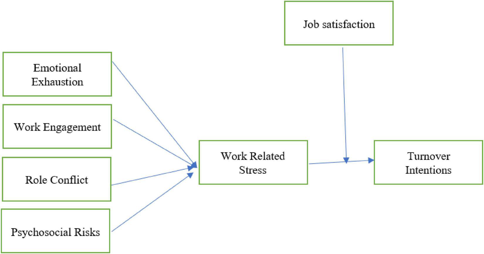 Therefore, this study investigates the impact of emotional exhaustion, work engagement, role conflict, and psychosocial risks on turnover intentions. Secondly, it aims to measure the mediation of work-related stress on emotional exhaustion, work engagement, role conflict, psychosocial risks, and turnover intentions. Thirdly, it analyzes the effect of work-related stress on turnover intentions and measures the moderation of job satisfaction between them.