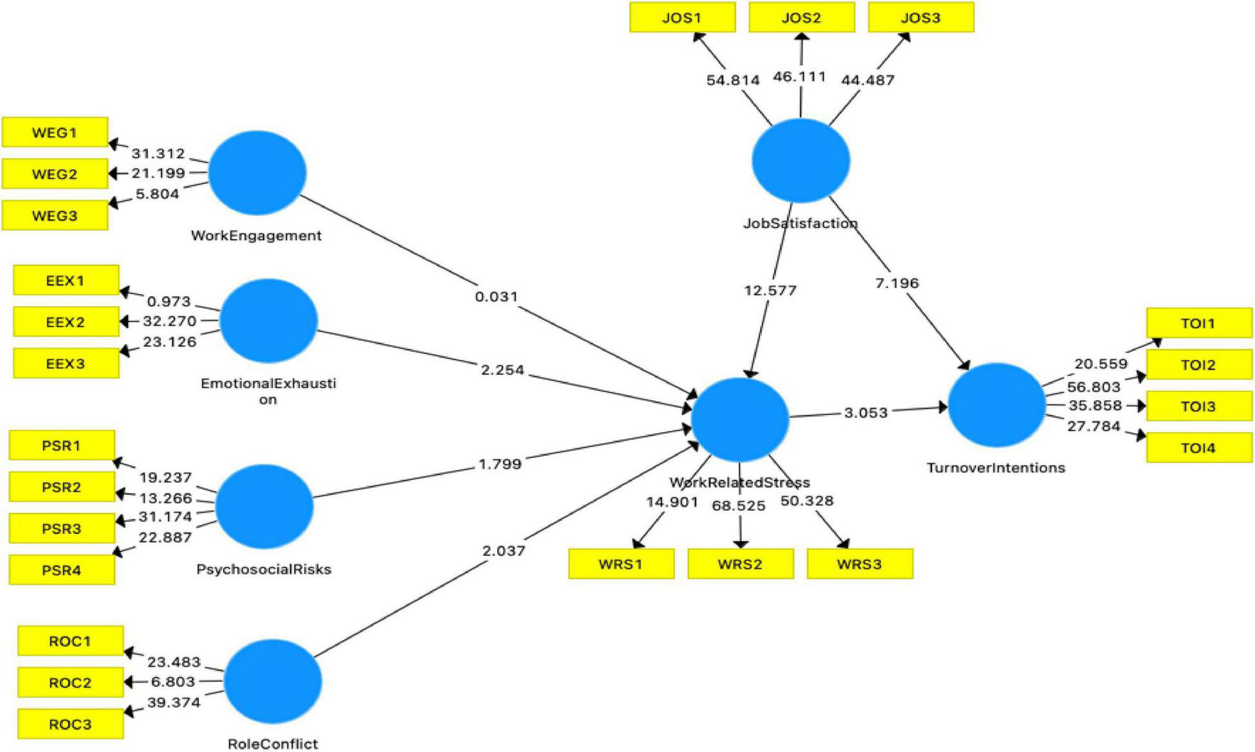 The association of emotional exhaustion with turnover intentions is strong, as shown by the result 0.623 and confirmed the acceptable association between constructs according to the criteria in this study. Further, the result 0.619 showed a strong and significant association of safety of work engagement with turnover intentions greater than 0.5. The value 0.711 indicated that the relationship of role conflict with turnover intentions is significant and strong, and the value 0.694 showed that psychosocial risks are strongly associated with turnover intentions. Therefore, work stress has a strong association with turnover intentions established by the result 0.605, and job satisfaction has a strong relation with turnover intentions that is confirmed by the result of 0.610 (Table 1).