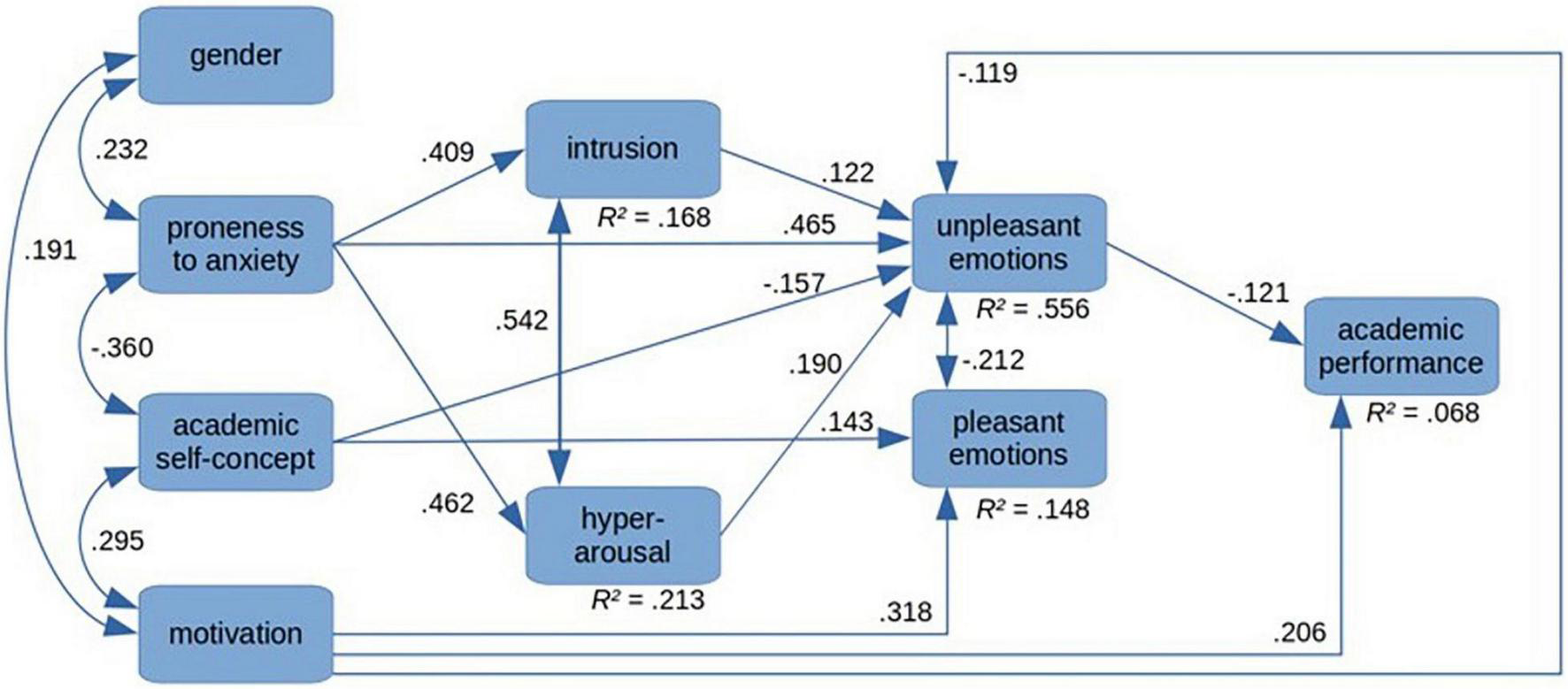 Proneness to anxiety contributed to intrusive thoughts (γ = 0.409) and to hyperarousal (γ = 0.462) and to unpleasant emotions (γ = 0.465). Academic self-concept was negatively related to unpleasant emotions (γ = −0.157) and to anxiety proneness (γ = −0.360). It was positively related to pleasant emotions (γ = 0.143) and to motivation (γ = 0.295). With a mean of 4.83 (SD = 0.94) for the academic self-concept, it was slightly above the scale mean of 4 (scale from 1 to 7). Via motivation academic self-concept was indirectly and positively related to performance.