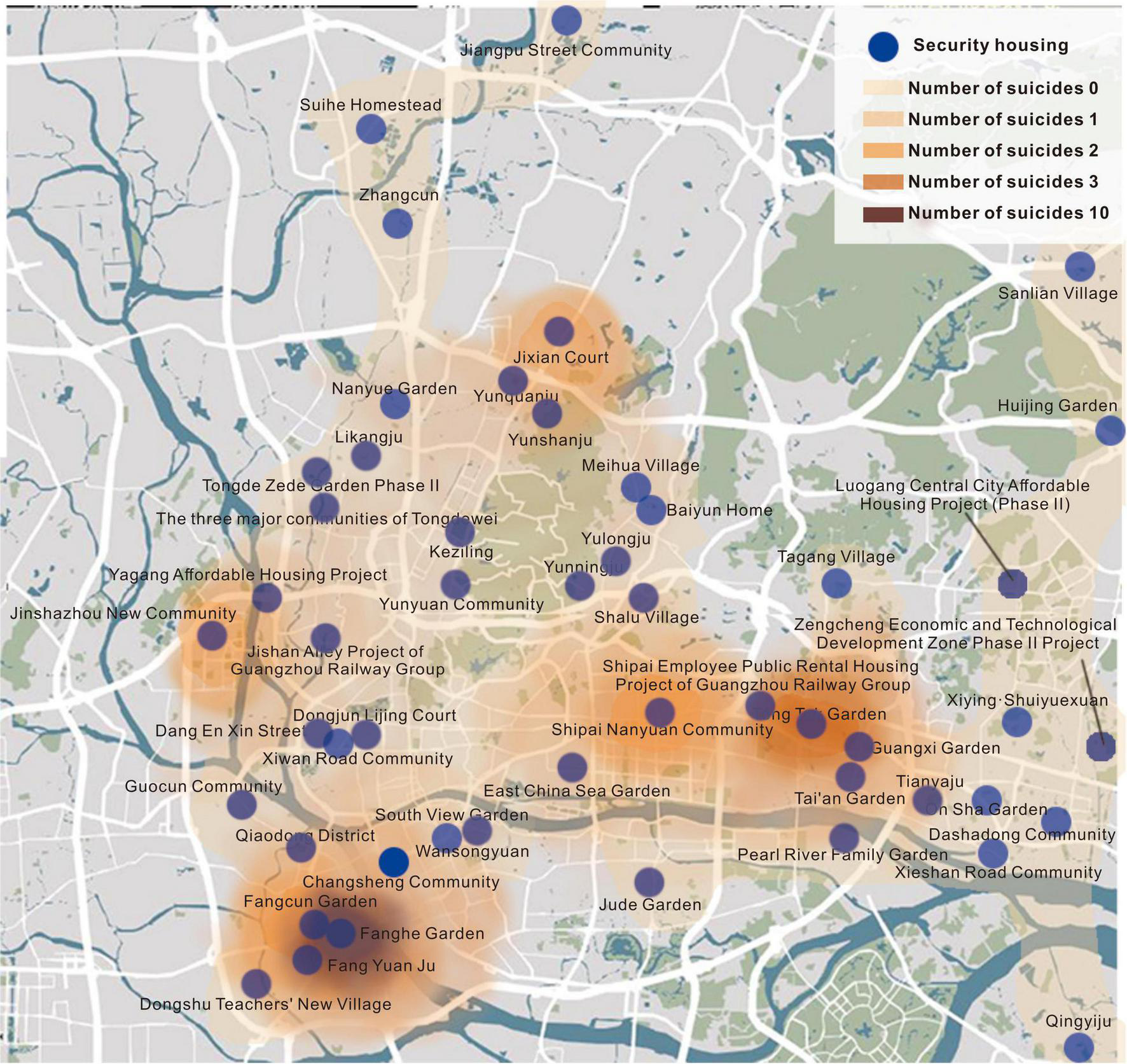 Distribution of suicide rate in affordable housing units in the downtown area of Guangzhou.