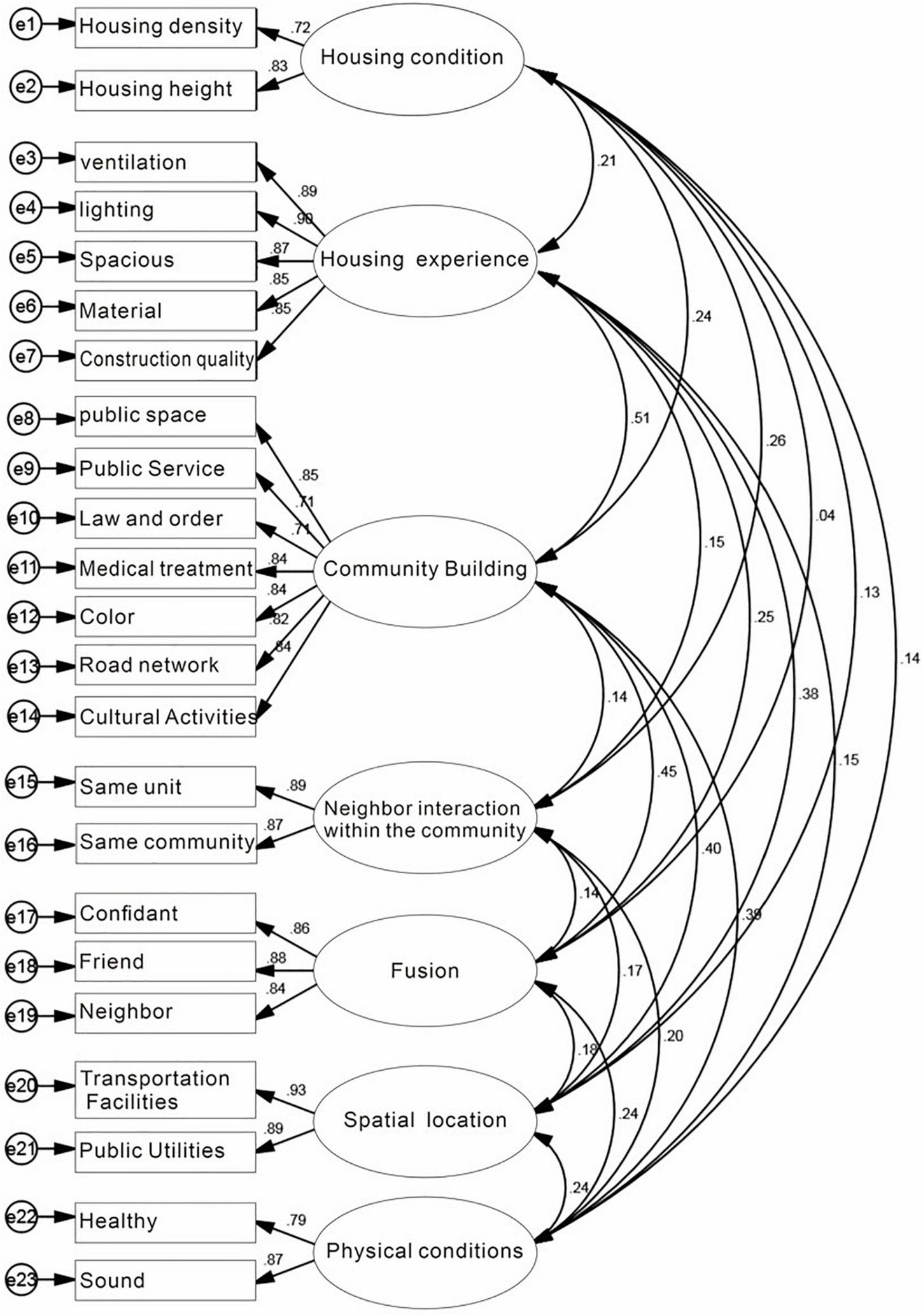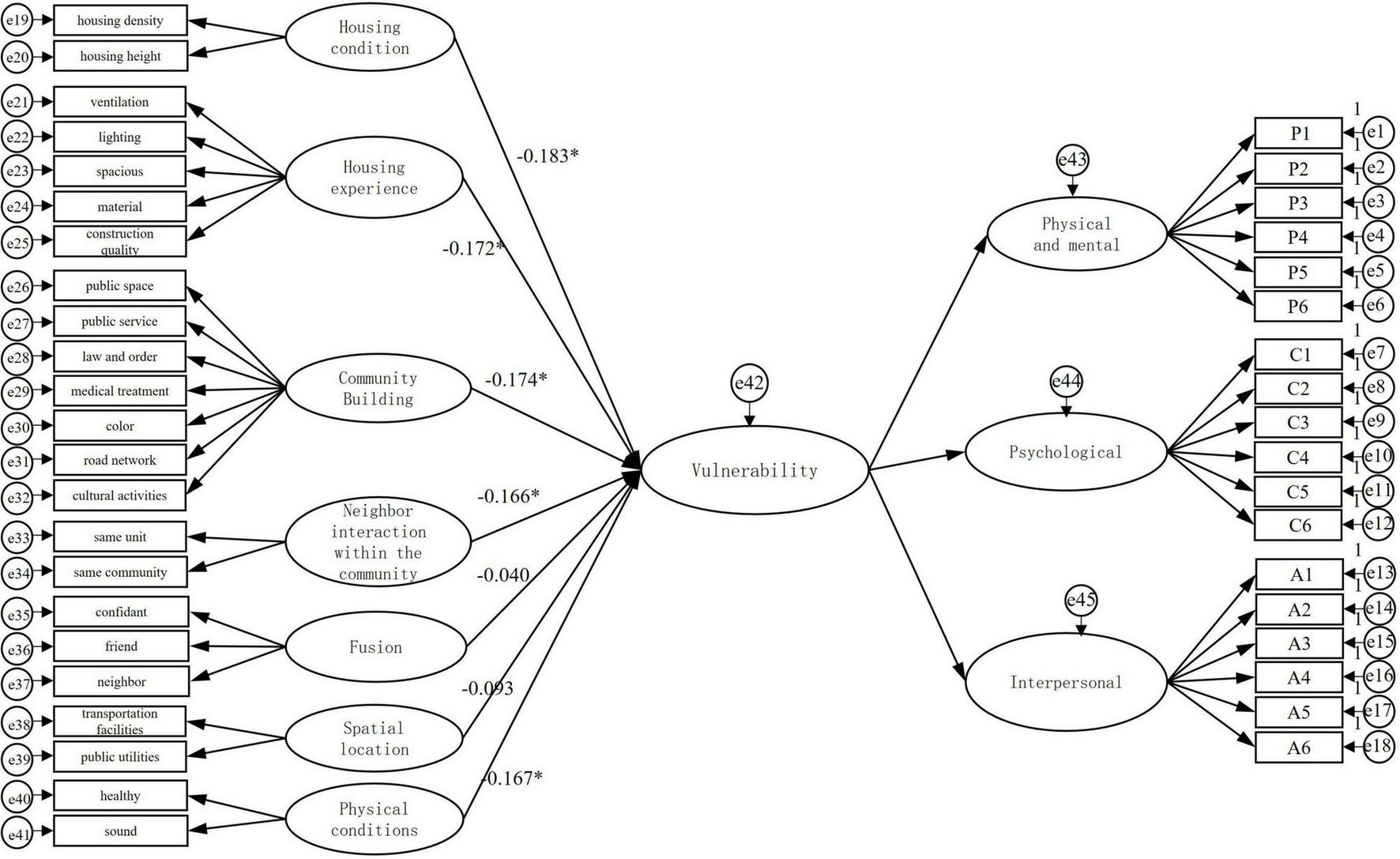 Structural equation modeling is a validated multivariate statistical analysis technique that has become an important analytical tool within quantitative research. Multiple indicator areas are used to reflect latent variables and to analyze the relationships between concepts (factors) throughout the model (Hou and Cheng, 1999; Cheng, 2006). The current study used AMOS software to develop a structural equation model and explored the main causes affecting the mental vulnerability of the residents of Fanghe Garden in combination with SPSS 20.0.