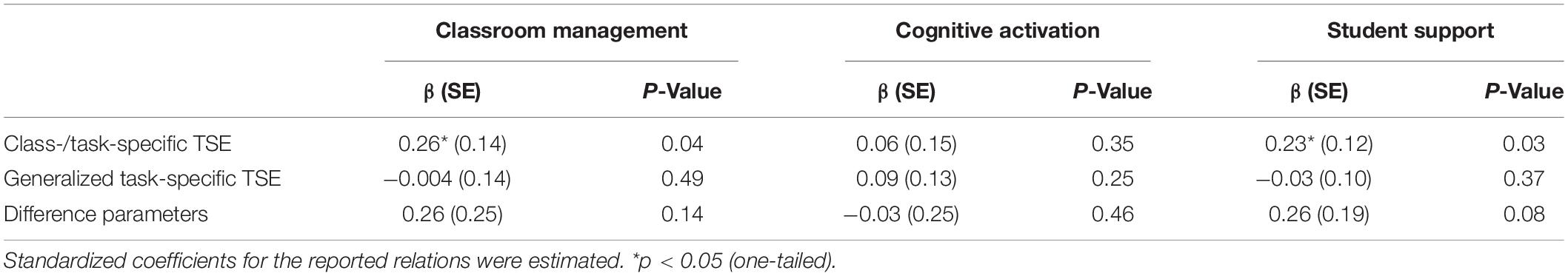Our findings indicate stronger relations between class-/task-specific TSE and teaching quality than that with generalized task-specific TSE. Significant positive relations between class-/task-specific TSE and classroom management and student support were found. In contrast, no significant relations between teaching quality and generalized task-specific TSE were found.