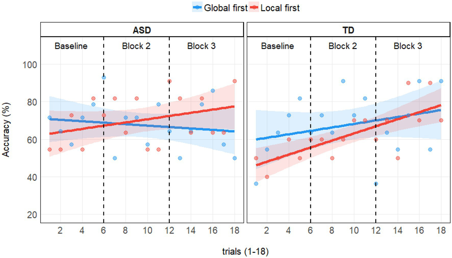 Average accuracies per group (ASD left panel; TD right panel) for each trial (1–18) depending on priming condition order in the Embedded Figure Task (EFT). One point depicts the percentage of accurate responses per trial number in groups (ASD left panel; TD right panel) and condition orders (global first in blue; local first in red). Linear regression lines with confidence bands fitted per group and condition order combination. Black dashed lines illustrate the block limits: Trials 1–6 were baseline trials, which were followed by two blocks each with 6 trials that included global or local priming in a counterbalanced order.