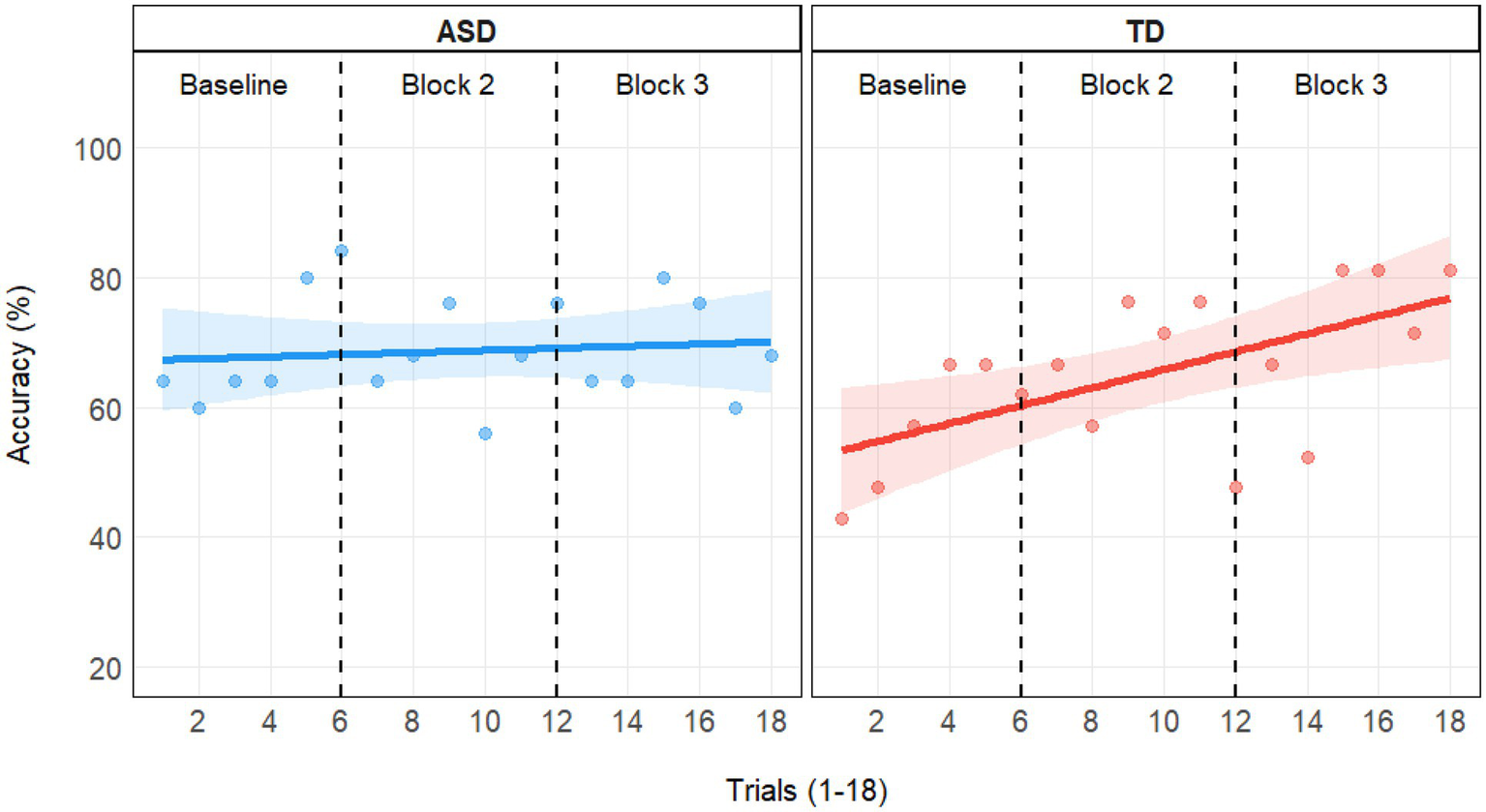Average accuracies per group (ASD left panel; TD right panel) for each trial (1–18) in the Embedded Figure Task (EFT). One point depicts the percentage of accurate responses in the Embedded Figures Task per trial number in groups (ASD left panel; TD right panel). Linear regression lines with confidence bands fitted per group. Black dashed lines illustrate the block limits: Trials 1–6 were baseline trials, which were followed by two blocks each with 6 trials that included global or local priming in a counterbalanced order.