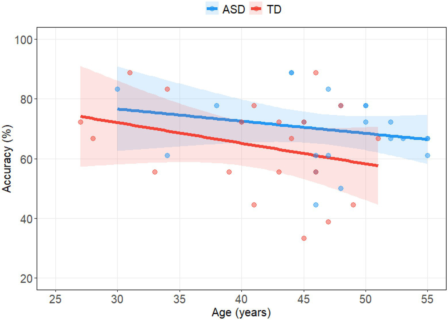 Correlations of age and average accuracies in Embedded Figure Tasks (EFT) in ASD group (blue) and TD group (red). One point represents the age and mean accuracy over all Embedded Figure Task (EFT) trials of one participant. Linear regression lines with confidence bands depict negative slopes in both groups.