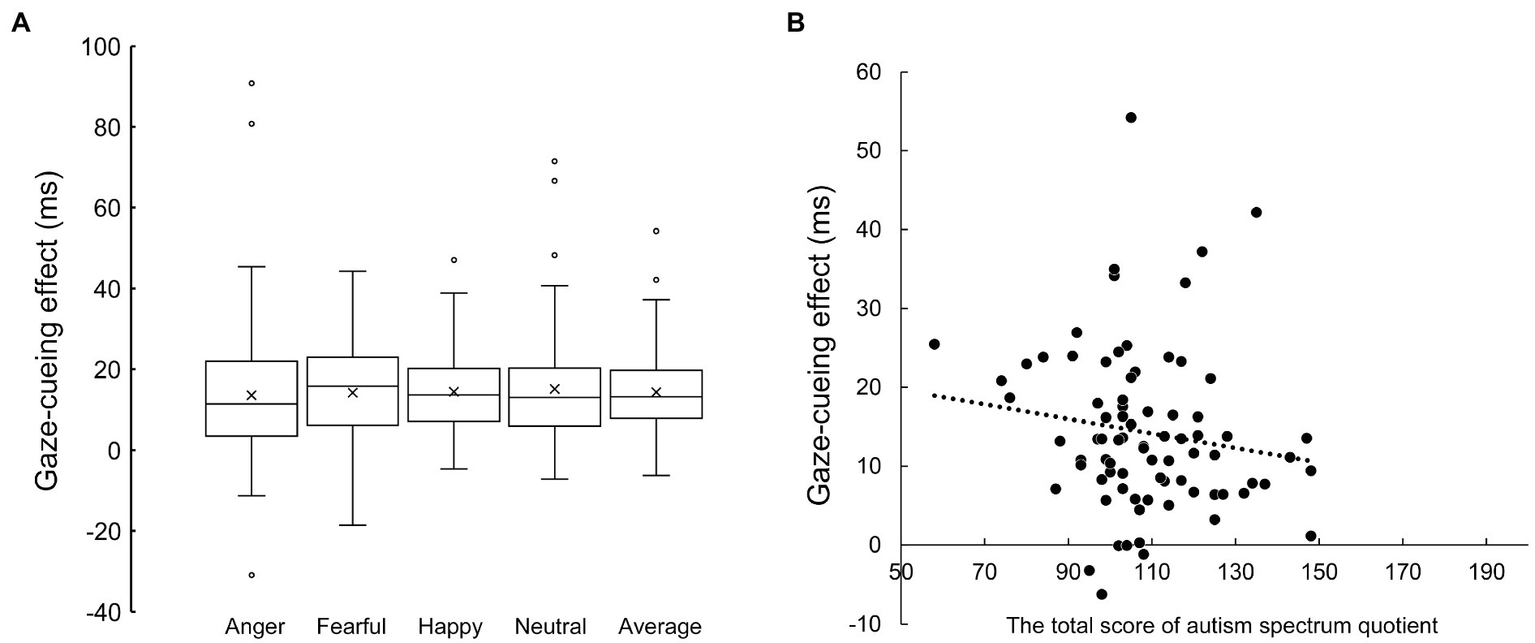 Consistent with investigations of clinically diagnosed ASD, previous studies have reported that the degree of autistic traits in the general population influences the gaze-cueing effect of emotional and neutral faces. Previous studies using neutral faces as cues have reported that, compared to individuals with high-autistic traits, individuals with low autistic traits show an enhanced gaze-cueing effect (Bayliss et al., 2005) when a specific kind of target appears (integrated vs. scrambled objects: Bayliss and Tipper, 2005; voice vs. tone: Zhao et al., 2015). However, other studies did not find such an association of autistic traits with the gaze-cueing effect of neutral faces (Lachat et al., 2012a; de Araujo et al., 2021). Lassalle and Itier (2015a) used dynamic cues which changed emotional expression after gaze deviation and showed that the gaze-cueing effect of fearful faces was larger than that of happy faces in participants with high-autistic traits. Further, the smaller gaze-cueing effect of happy faces was associated with higher autistic traits. Recent studies with large sample sizes have reported contradictory findings concerning the relationship between autistic traits and the gaze-cueing effect of emotional faces. Similar to Lassalle and Itier (2015a), McCrackin and Itier (2019) used the dynamic cues; they found that a stronger autistic trait (i.e., attention to detail) was associated with a weaker gaze-cueing effect from fearful and happy faces. In contrast, Talipski et al. (2020) used static emotional faces which appeared prior to the change of their gaze direction; they did not find any emotional enhancement of the gaze-cueing effect, nor did they find any association between autistic traits and the gaze-cueing effect of emotional faces. Thus, the evidence is not conclusive regarding the association between the gaze-cueing effect and autistic traits in the general population.