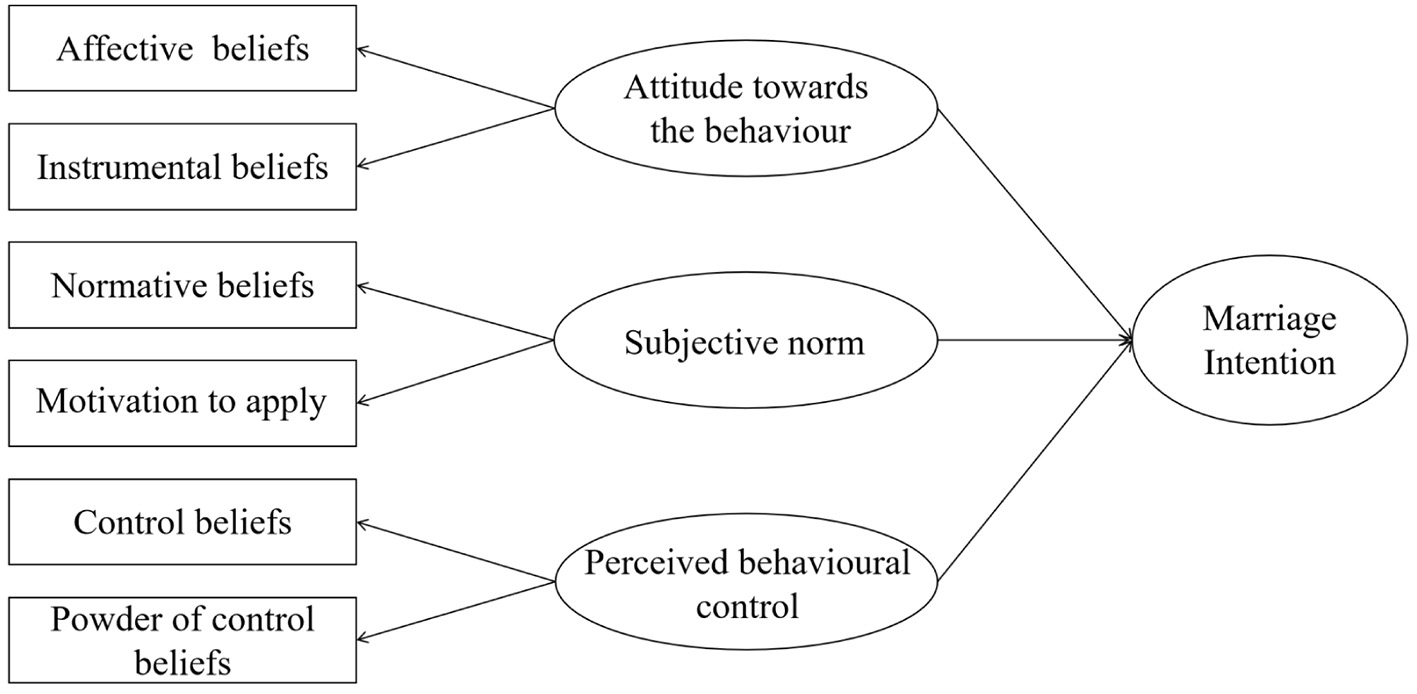 In China, the young generation is facing the impact and influence of social transformation. Some young people's expectations for marriage include the superposition of lookism, materialism, romanticism, comparison, and departmentalism (Mu, 2021). The serious imbalance between the number of men and women, as well as high real estate rates and child-rearing costs are also reliable explanations for the current low marriage rate. Young people's marriage behaviour affects social changes (Raymo, 2003; Yabiku, 2004; Nobles and Buttenheim, 2008). If the young generation's marriage intention is kept low, the phenomenon of low fertility and an ageing population in China will become increasingly serious. College students are the backbone of youth groups and an important reserve of national talent. Their view of marriage can predict the development trend of marriage and family formation in China's future society to some extent, meanwhile also affecting China's social stability and economic development. Therefore, helping college students form an appropriate view of marriage and love and facilitating their smooth entry into marriage is a topic of interest for many scholars. Previous research has focused on college students' love attitudes and motivations, mate selection methods and criteria, and education on love and marriage (Zhang, 2019; Zhao, 2019; Kong and Zang, 2021). Most studies focus on the extraction of college students' beliefs about marriage and love, whereas few studies have investigated how these beliefs affect marriage intention and marriage behaviour. The theory of planned behaviour, developed by Ajzen (1991), proposes that individual behaviour intention is an important factor determining whether their actual behaviour occurs; further, this theory has also been supported by several empirical studies. Therefore, based on the theory of planned behaviour, this study explored the influential predictors and mechanisms of college students' marriage intentions and provides implications for pro-marriage policy.