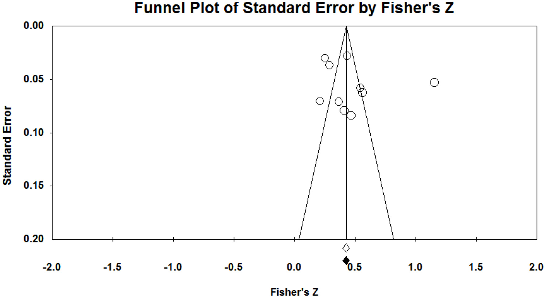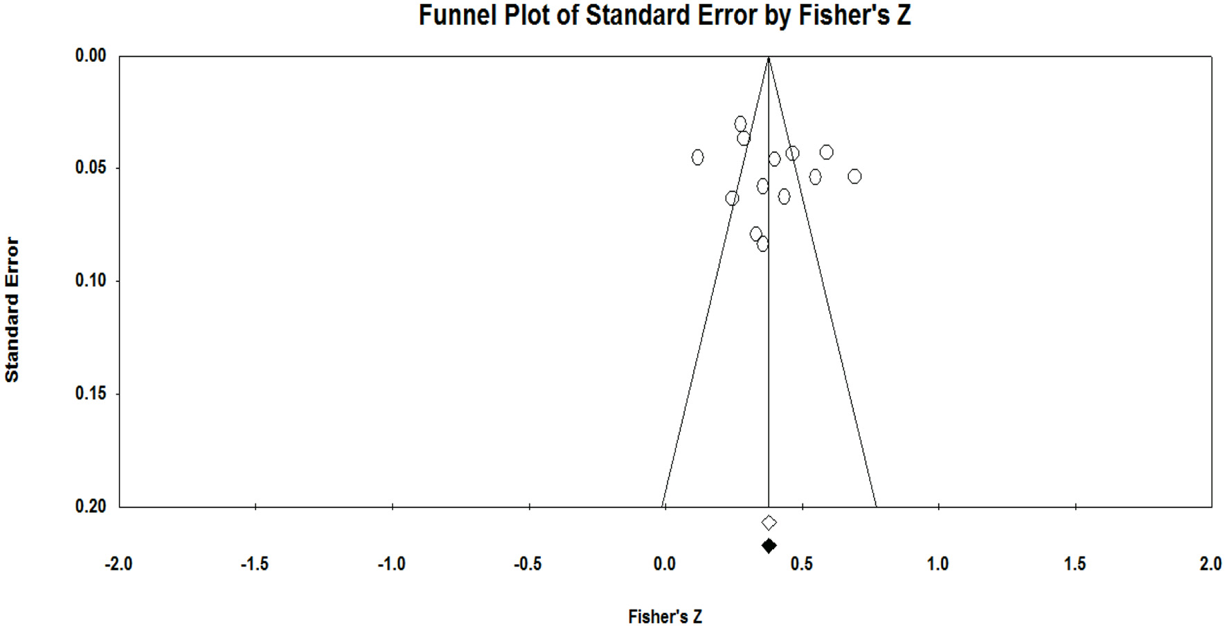 Funnel plot of team identification and intention to purchase licensed merchandise.