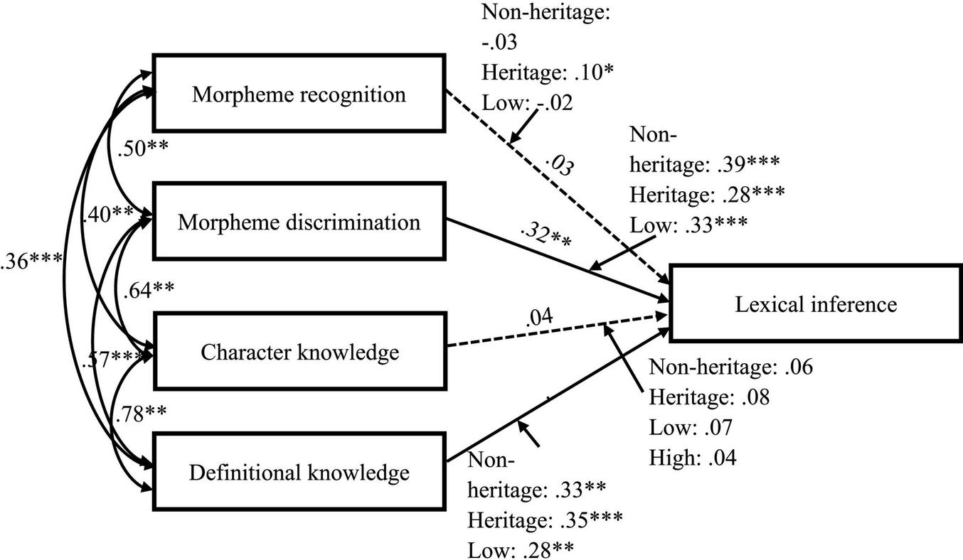 This study explored the effect of word knowledge facets (word-general and word-specific knowledge) on second language (L2) Chinese lexical inference by highlighting the moderating effect of language proficiency level and learners’ heritage status. L2 Chinese learners with a mixture of linguistic (low-intermediate and high-intermediate) and cultural (heritage and non-heritage) backgrounds completed a series of word-knowledge measurements as well as a lexical inferencing task. Through a moderated path model, the study demonstrated that word-general knowledge (morphological awareness) and word-specific knowledge (vocabulary knowledge) contributed to L2 Chinese lexical inference. In addition, the study underlined the moderating effect of heritage status on the correlation between word knowledge and lexical inference. Given the distinct patterns between heritage and non-heritage learners, morphological awareness may define the characteristics of reading profiles in the Chinese heritage learner population.