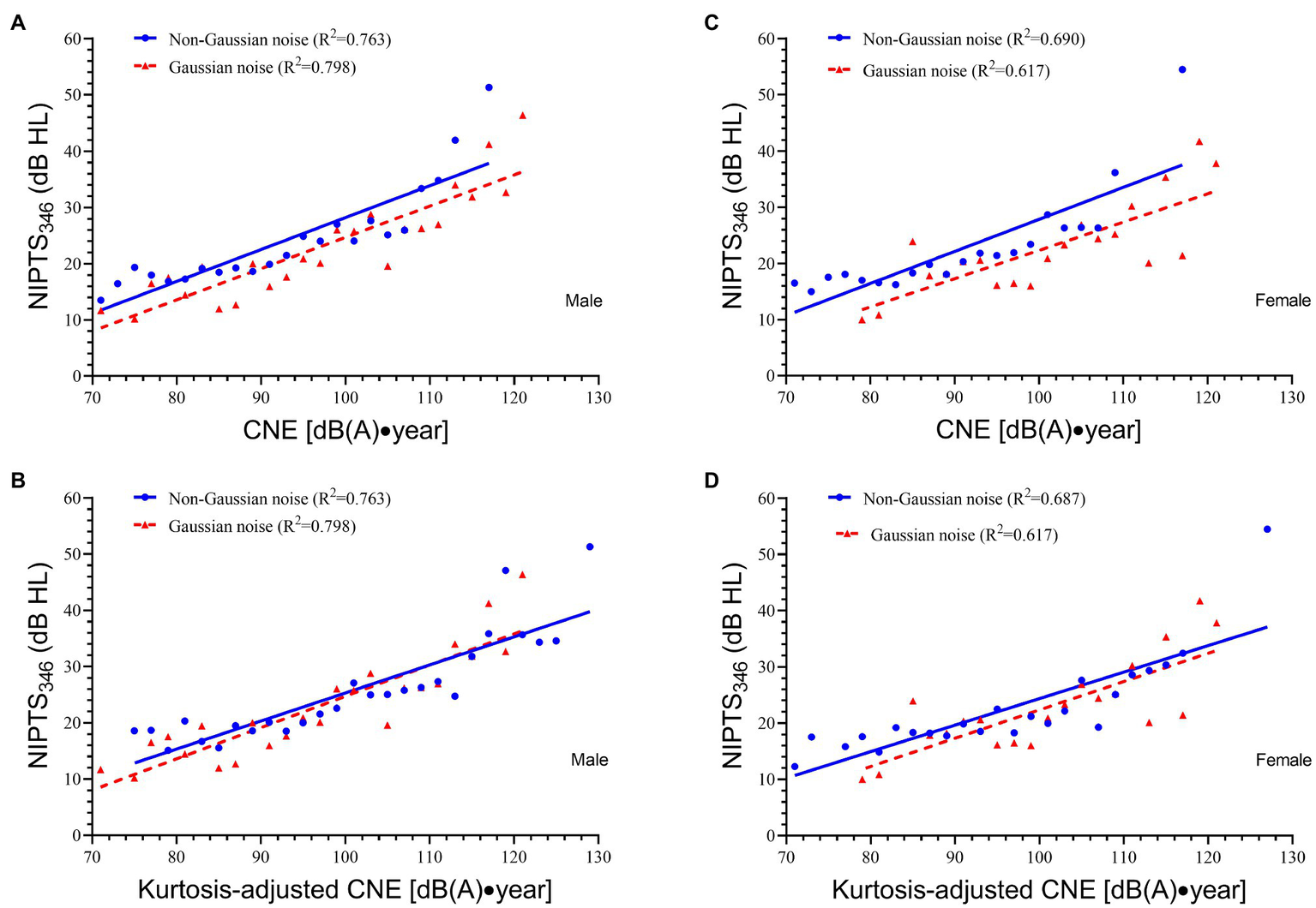 Figures 3A,B show the regression lines for workers aged 30 years or older, and Figures 3C,D for workers less than 30 years old. For workers aged ≥30, the line of non-Gaussian noise was above that of Gaussian noise when using CNE and became close to the line of Gaussian noise when using CNE′. The mean difference of NIPTS346 between two lines significantly decreased after CNE was adjusted by kurtosis (mean D1 = 4.10 dB HL, mean D2 = 1.13 dB HL, t = 15.80, p < 0.001). For workers aged <30, the mean difference of NIPTS346 when using CNE (mean D1 = 2.70 dB HL) was a little higher than CNE′ (mean D2 = 2.53 dB HL), although the difference was not statistically significant (t = 0.38, p = 0.707).