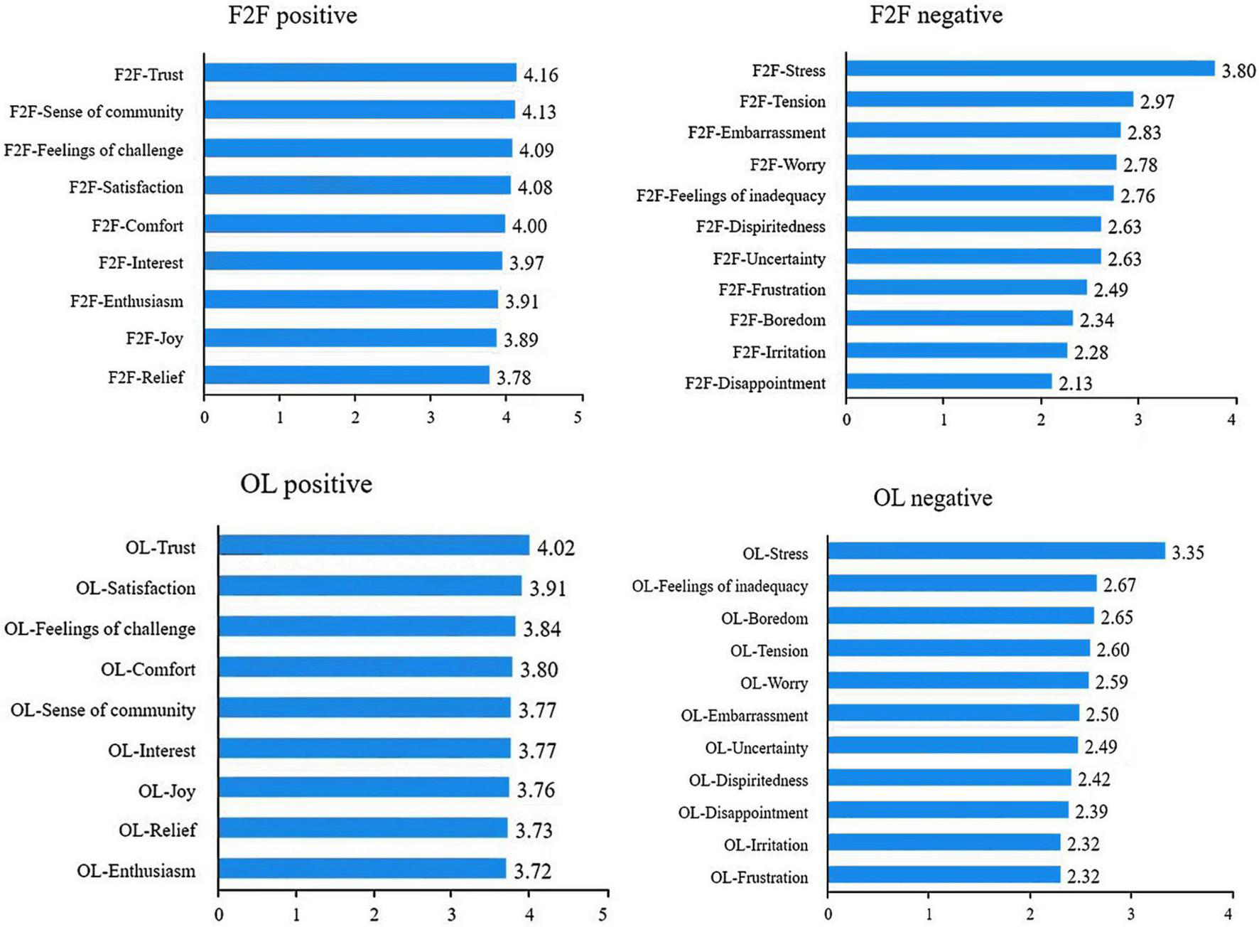 Figure 1. Detailed emotional experience for F2F and online learning (each sorted by mean value). OL, online; F2F, face-to-face. N = 88.