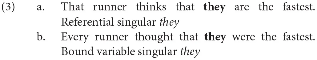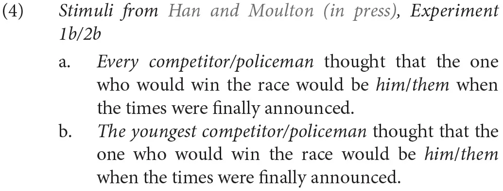 That they is interpreted as singular in both sentences in (3) is illustrated by the plausibility of the thought attributed to each runner: that they themselves, not a plurality of runners, are the unique fastest runner. Previous studies (Camilliere et al., 2019; Conrod, 2019; Han and Moulton, in press) have shown that English users generally prefer they over alternatives such as he or she as bound variables, particularly when the antecedent phrase does not express gender, as with runner in (3b). The processing studies on bound singular they suggest that it also has an advantage over referential they, at least for the English speakers who participated in those studies. For instance, Foertsch and Gernsbacher (1997) found that they can resolve to singular quantified antecedents without apparent difficulty regardless of the gender of the antecedent. Ackerman (2018) compared sentences employing themself with gendered and non-gendered antecedents, finding a processing advantage using eye-tracking while reading for gender stereotyped quantified antecedents (indefinites like a mechanic) as compared to referential antecedents (stereotyped proper names).