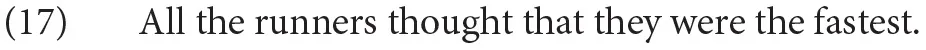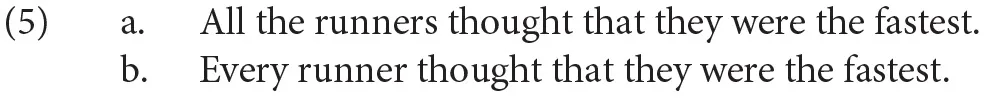 No study reported to date, however, compares bound variable singular they with a plural vs. singular antecedent, and so cannot directly answer the question of whether bound variable singular they incurs a cost when taking a morphologically singular quantified antecedent like every. In the studies that follow, we make this comparison by capitalizing on configurations in English where a morphologically plural quantified noun phrase, headed by all, can bind they with a singular interpretation. This is shown in (5a) (Rullmann, 2003; Sudo, 2014). As with the bound variable sentence in (3b), repeated in (5b), this sentence attributes a pragmatically plausible thought to all the runners—that only one singular individual, they themselves, is the fastest runner.
