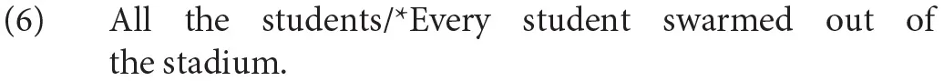 While contrasting these two quantified expressions offers a novel way to examine the role of morphological number in processing bound variable they, the two quantifiers differ along a semantic dimension, namely the difference between collective and distributive interpretations. Every often resists a collective reading, while all generally allows one. With a predicate such as swarm, which requires a plural argument, a noun phrase quantified by every is not acceptable, whereas one quantified by all is (6) (Morgan, 1984; Winter, 2002).